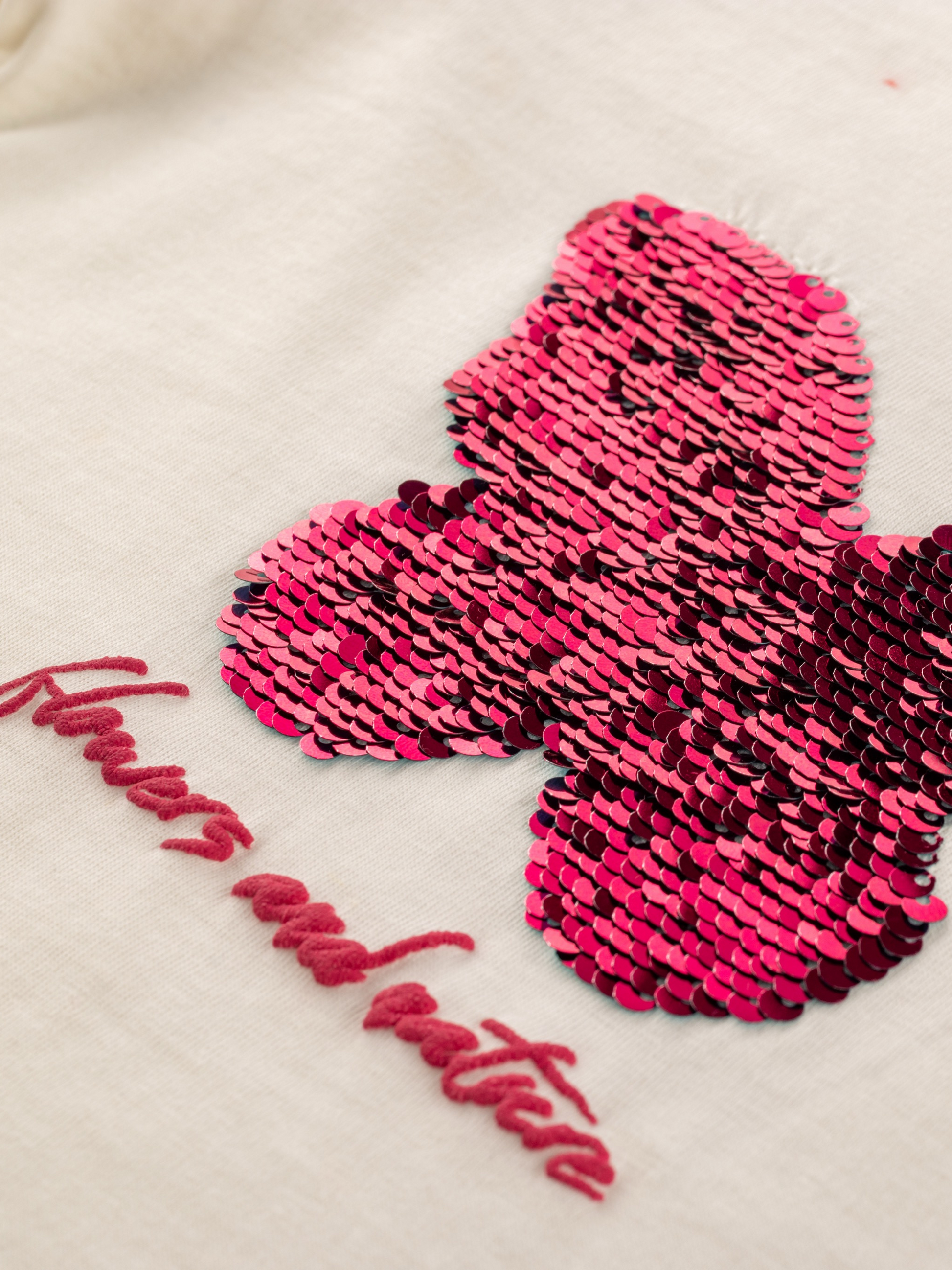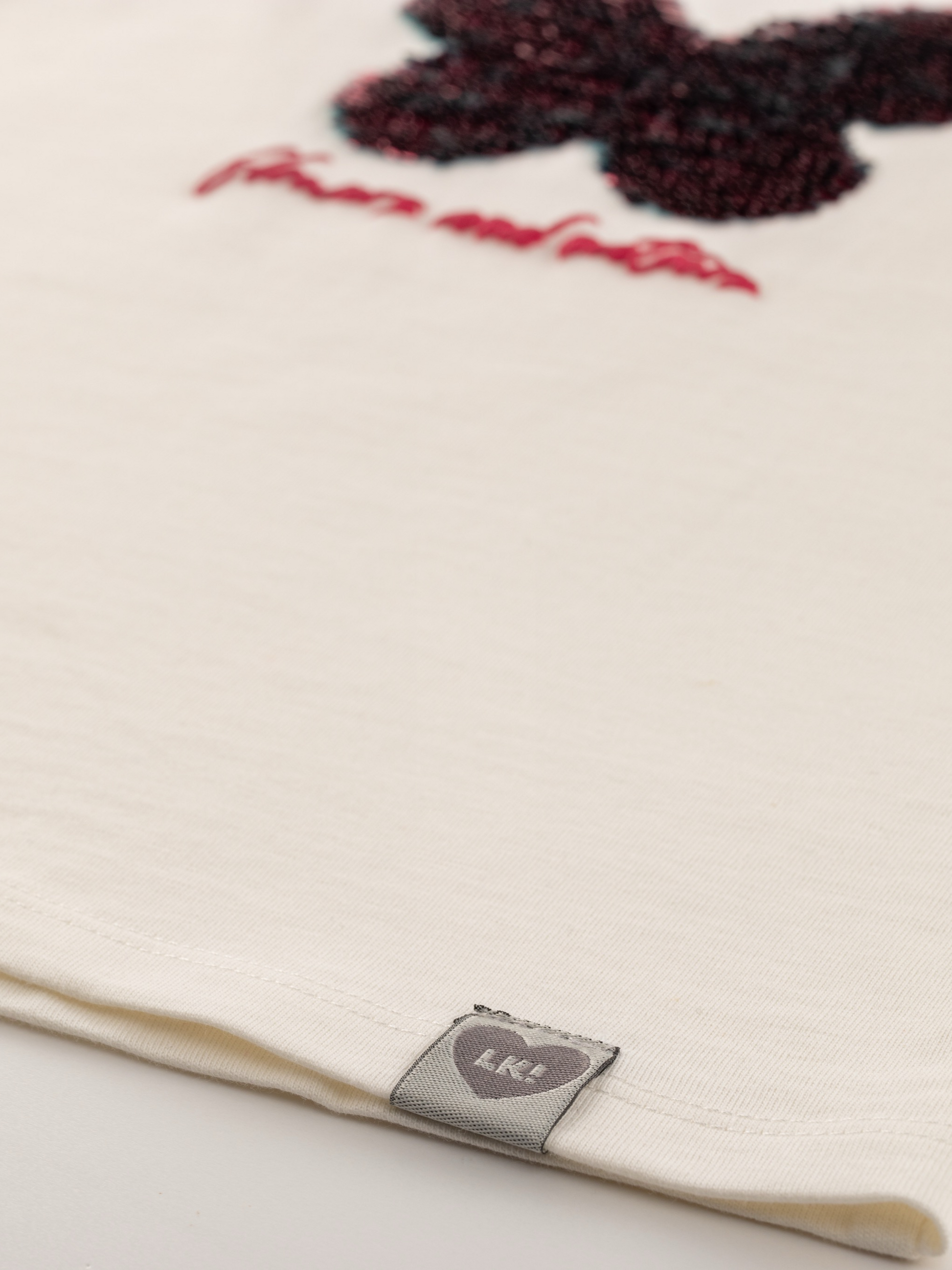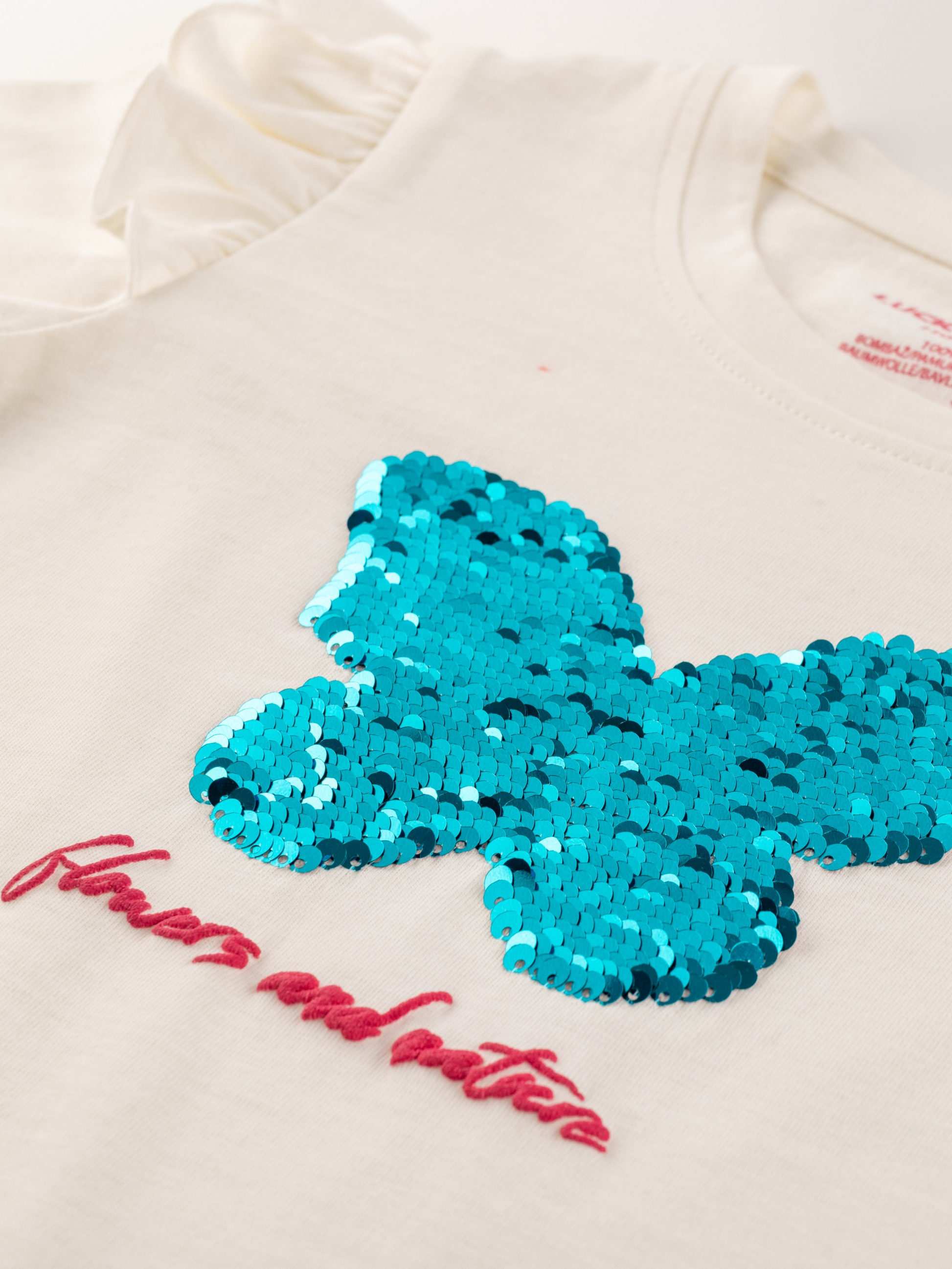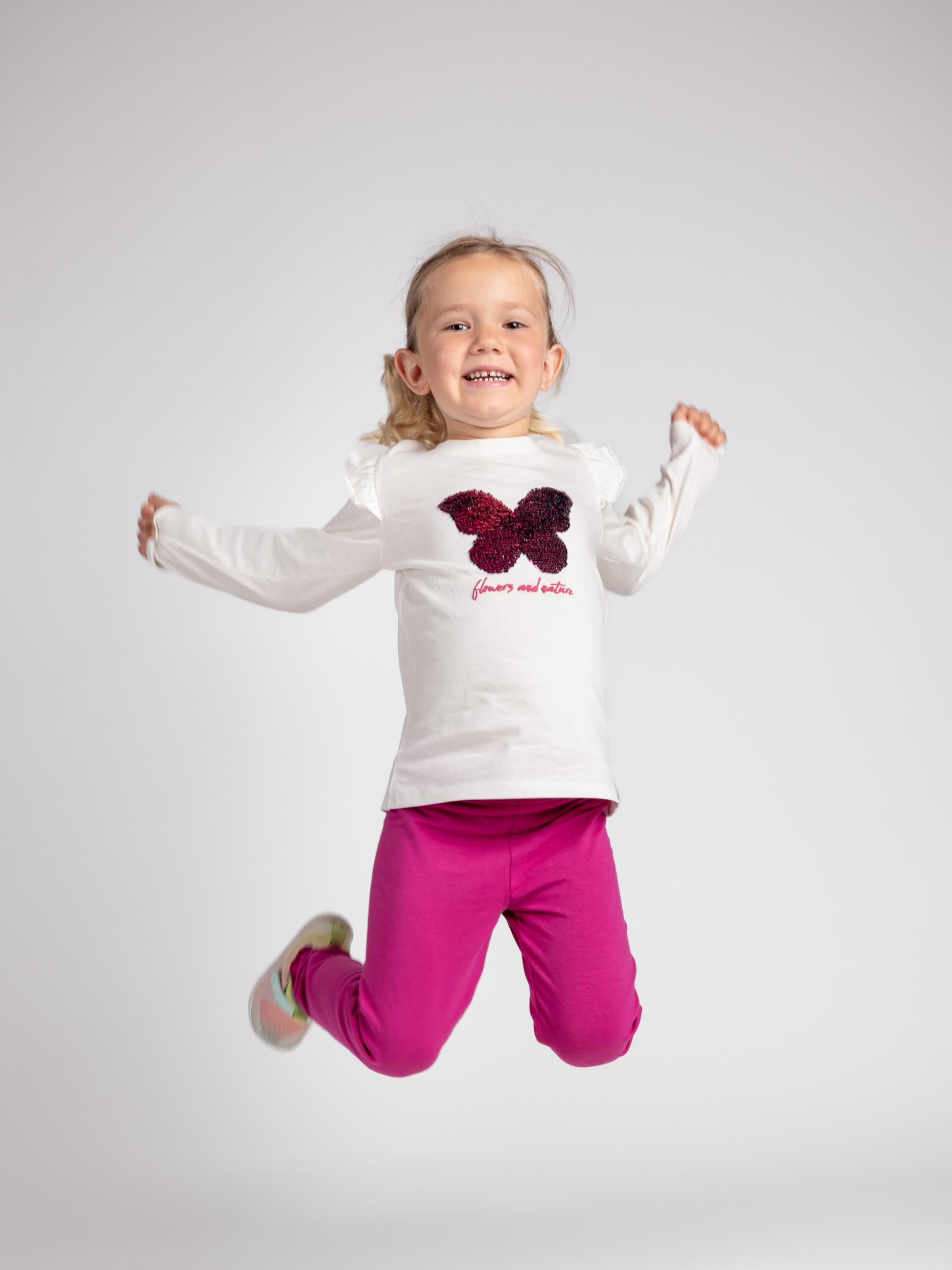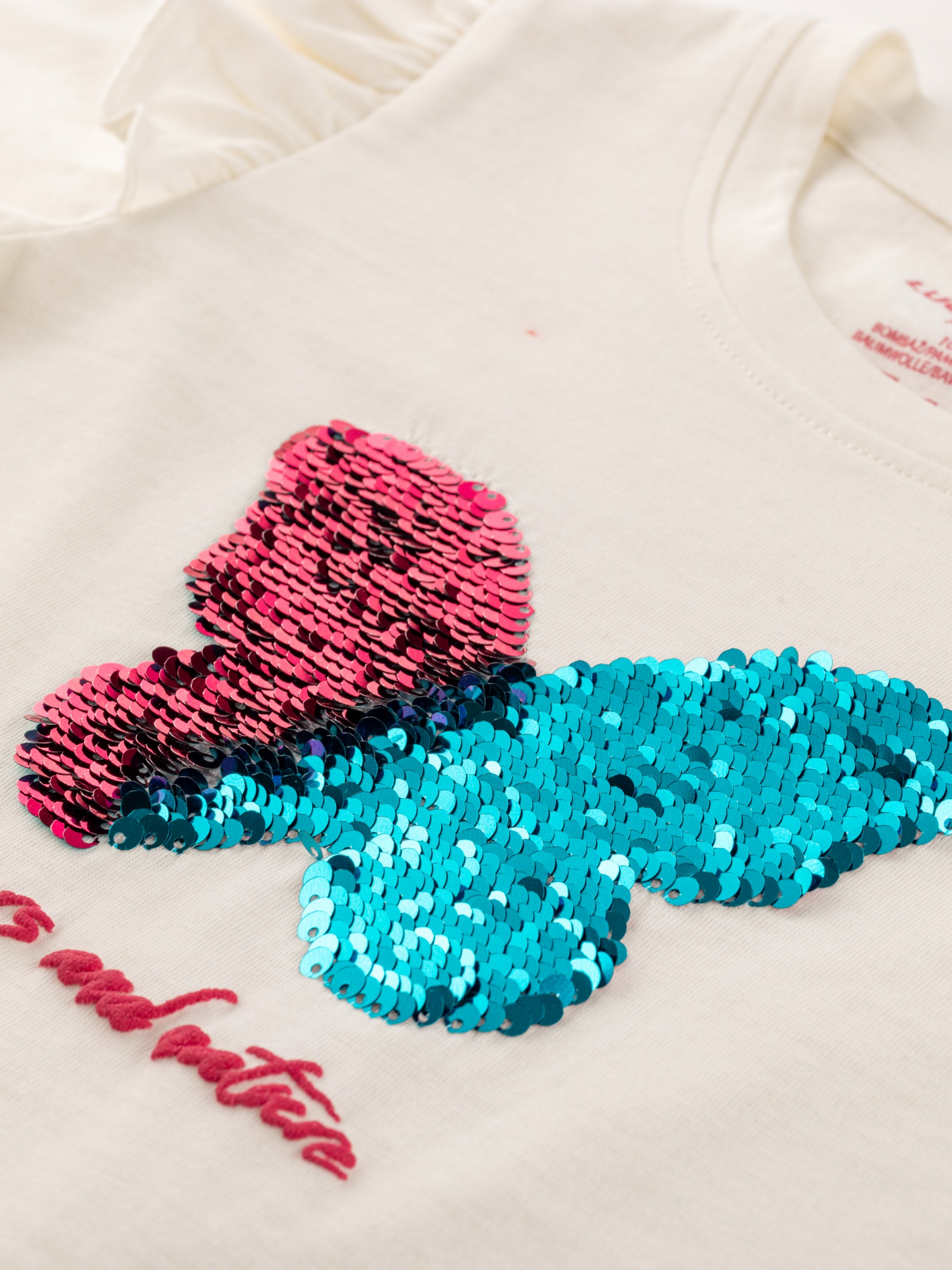 Krásne dievčenské tričko s nádhernými detailmi na ramenách a veľmi špeciálnou aplikáciou motýľa, ktorého si každá malá princezná môže zafarbiť podľa svojho vkusu - na ružovo alebo na modro. Pohodlné a všestranné, vhodné na všetky príležitosti, kde chcú dievčatá zažiariť a ukázať svoju jedinečnú kreativitu!