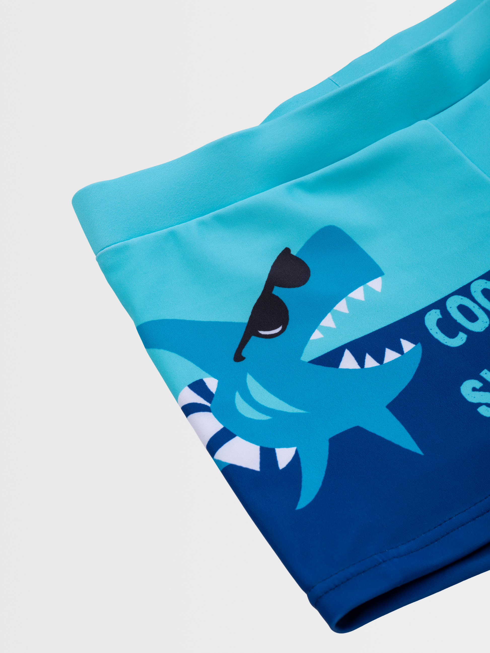 Chlapčenské boxerkové plavky v dvoch odtieňoch modrej farby s parádnym žralokom – zábavná voľba pre nebojácnych chlapcov.