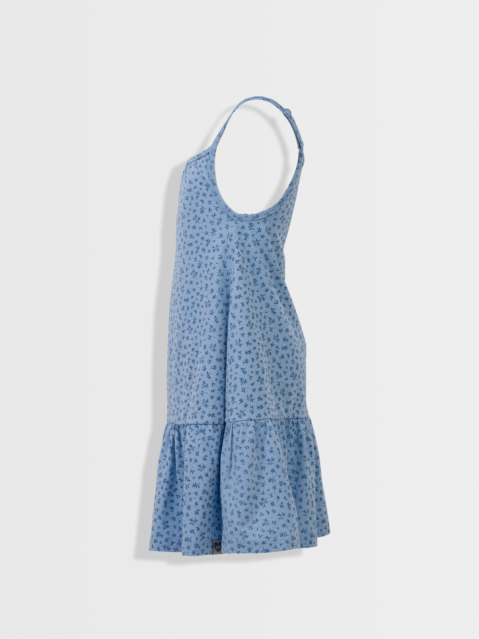 Dievčenské letné šaty v modrej farbe s jemnou potlačou a volánovou spodnou časťou – sladký a pohodlný kúsok na leto!