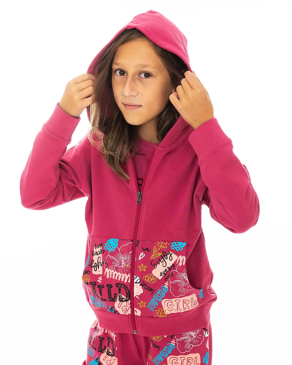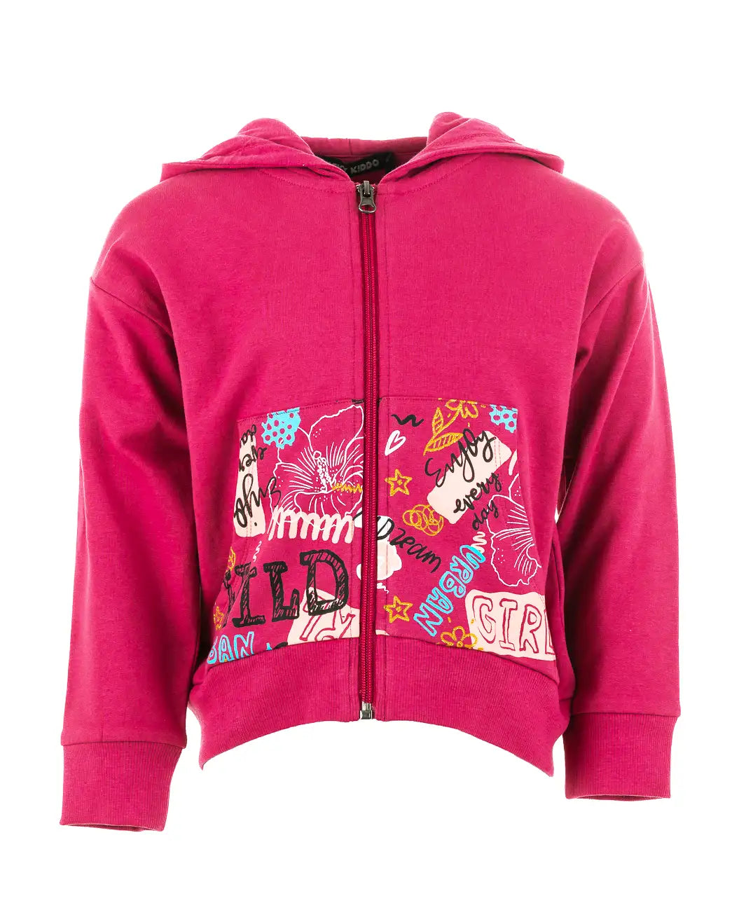 100% cotton Girls hooded cardigan with print on pockets