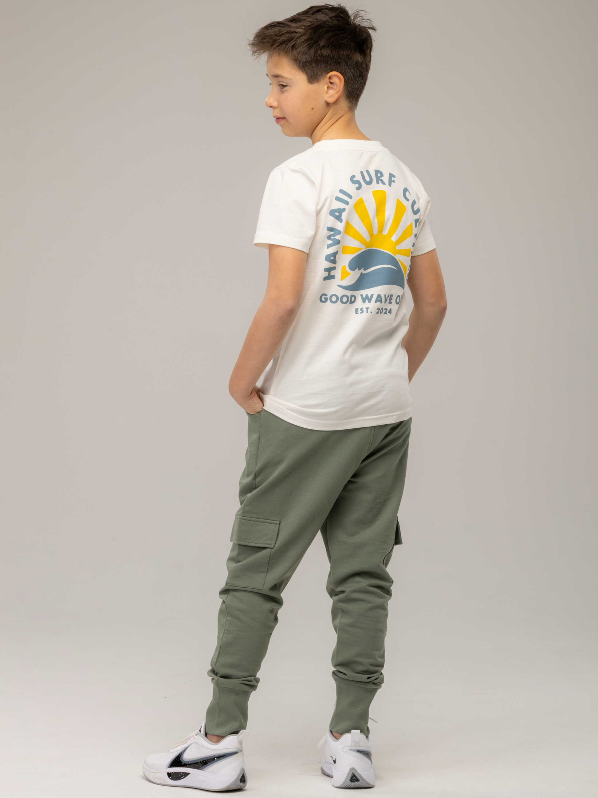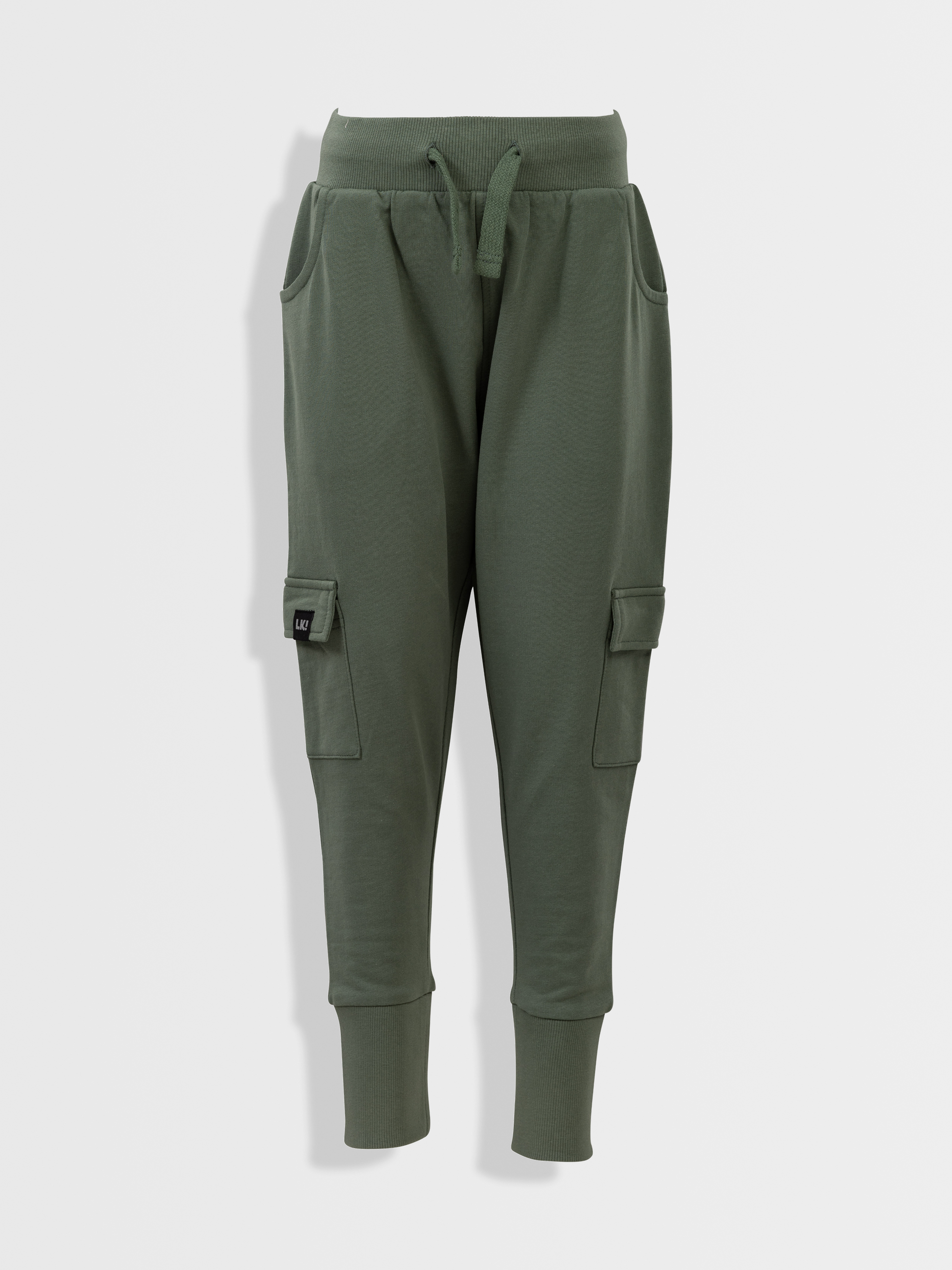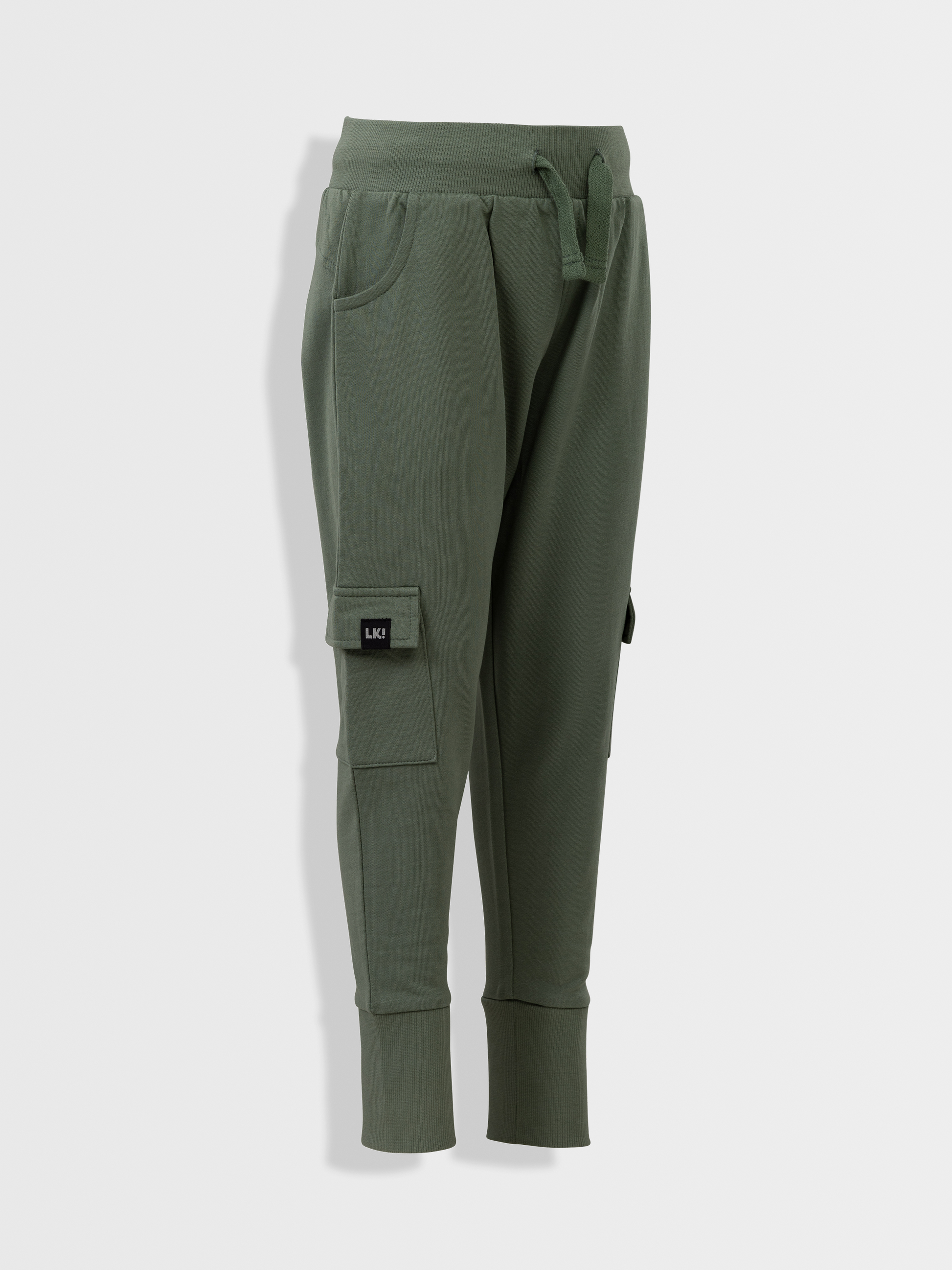 Chlapčenské tepláky s bočnými vreckami v zelenej farbe, navrhnuté pre pohodlie a praktickosť.