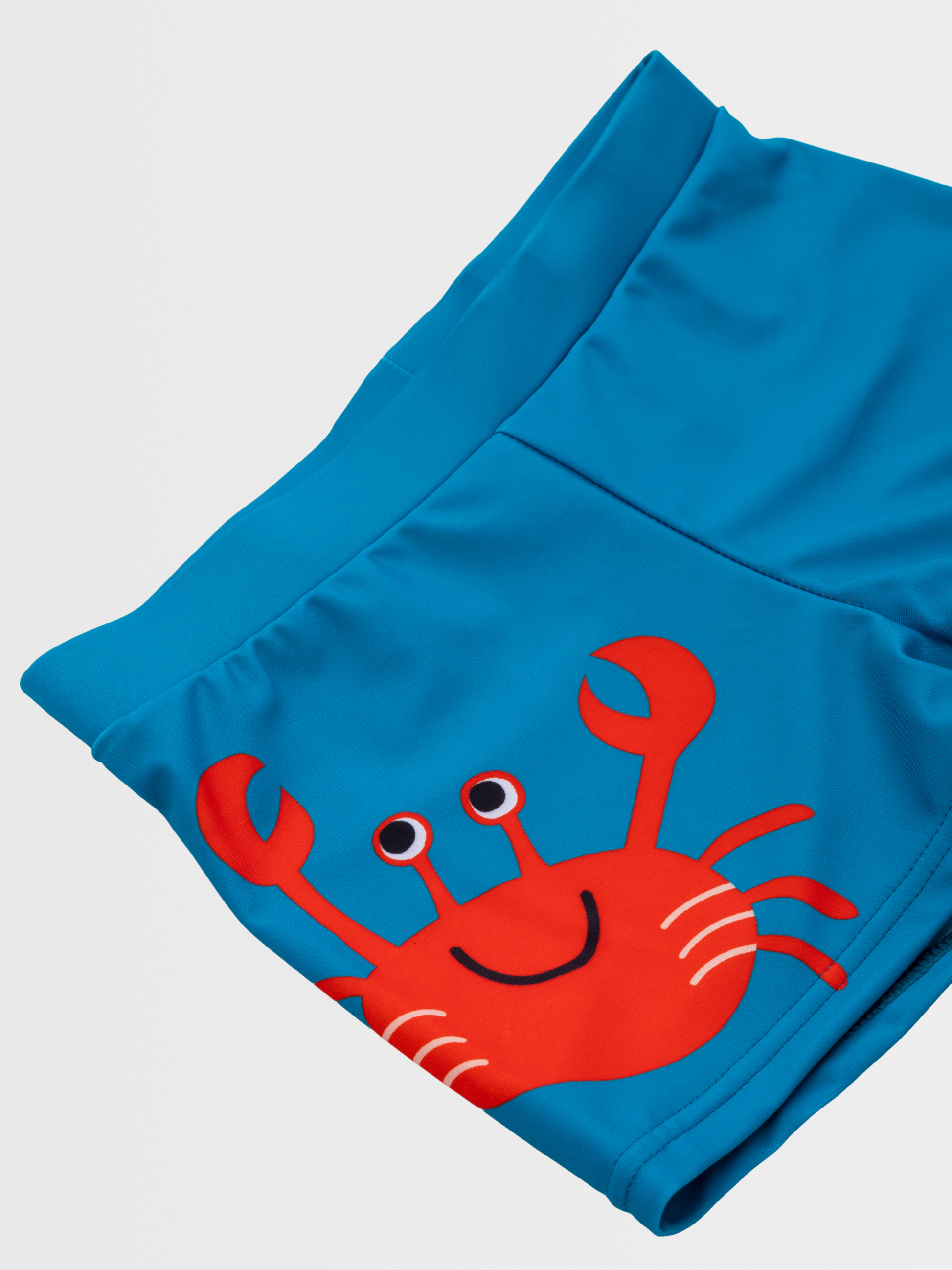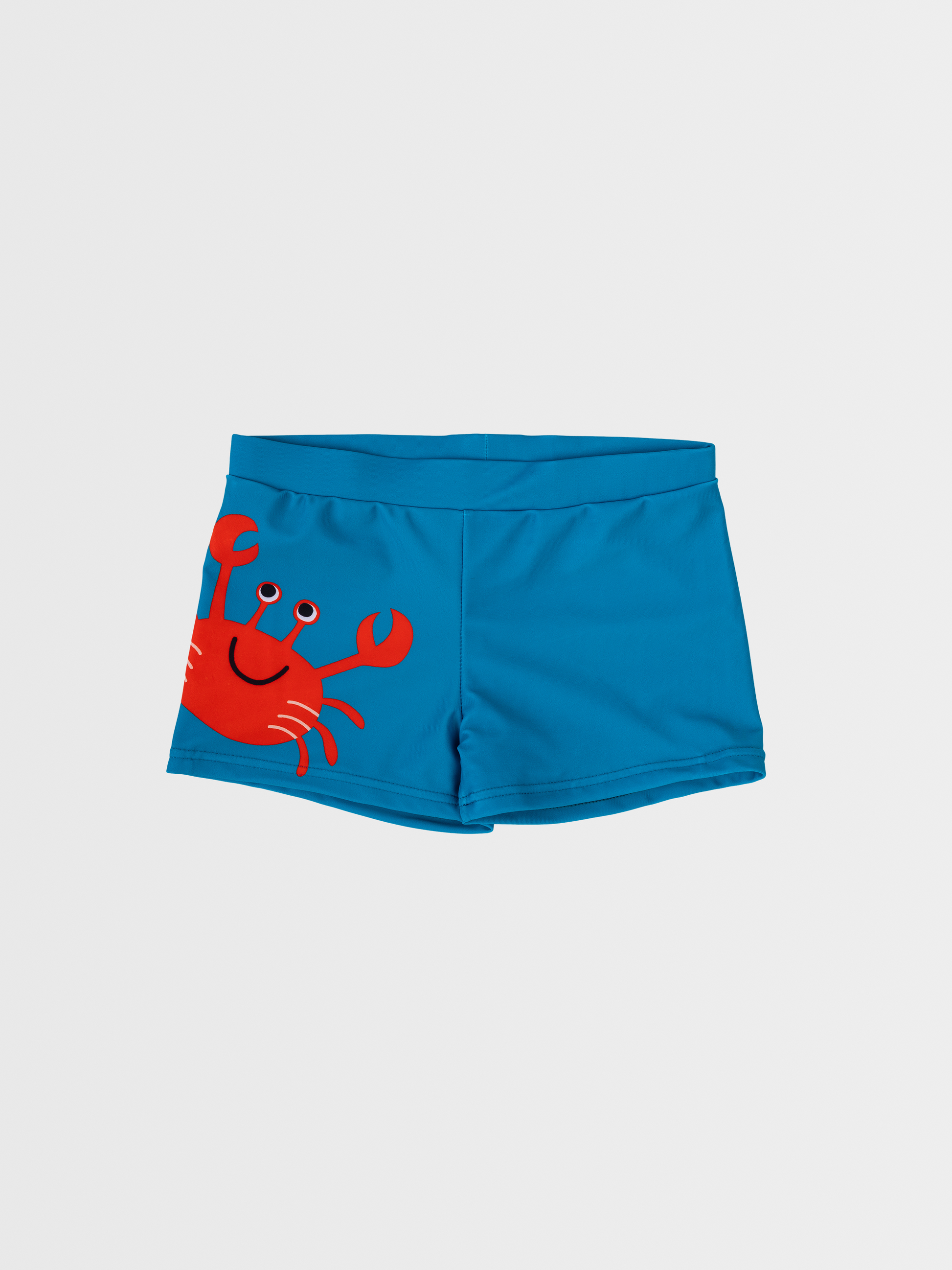 Chlapčenské boxerkové plavky v tyrkysovomodrej farbe s potlačou morských krabov – ideálna voľba na letné dobrodružstvá.