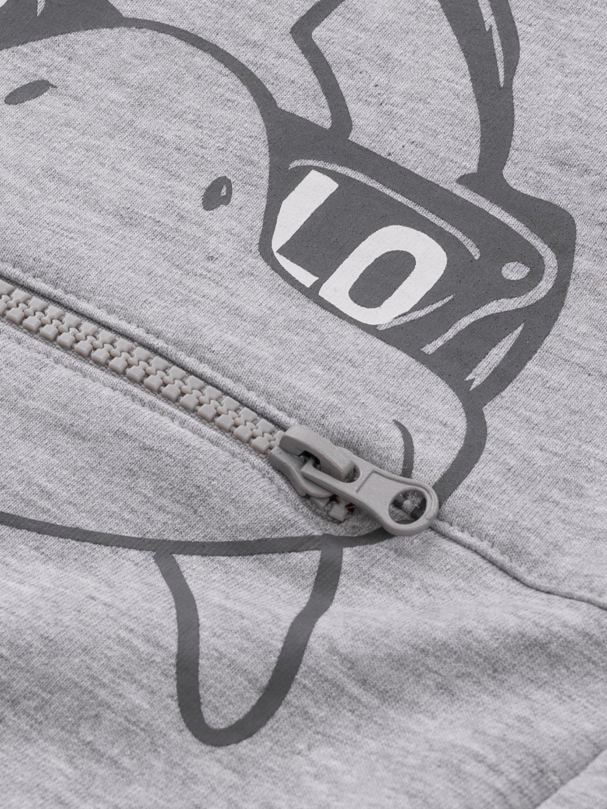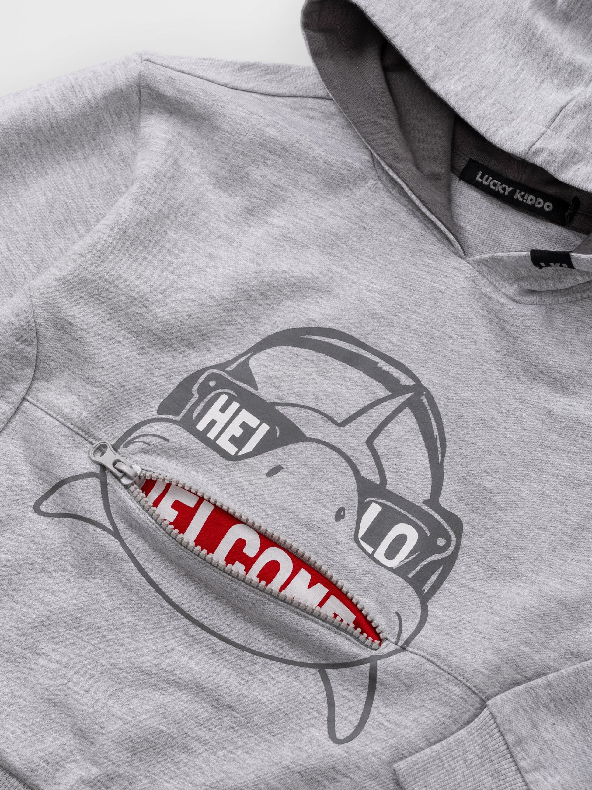 Mikina s kapucňou s potlačou žraloka a predným vreckom na zips predstavujúci žraločie zuby.