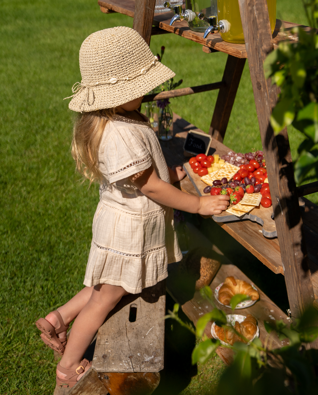 Dievčenské letné šaty Lucky Kiddo v jemnej bielej farbe sú tou správnou voľbou pre dievčatá, ktoré milujú ľahkosť a hravosť. Vyrobené zo 100 % bavlny, poskytujú prirodzenú priedušnosť, mäkkosť a pohodlie počas celého dňa. Mierne nadýchané rukávy s vyšívanými detailmi a volánový lem dodávajú osobitý šarm, zatiaľ čo spadnutý pás vytvára uvoľnený a módny vzhľad. Zapínanie na gombíky na zadnej strane uľahčuje obliekanie.