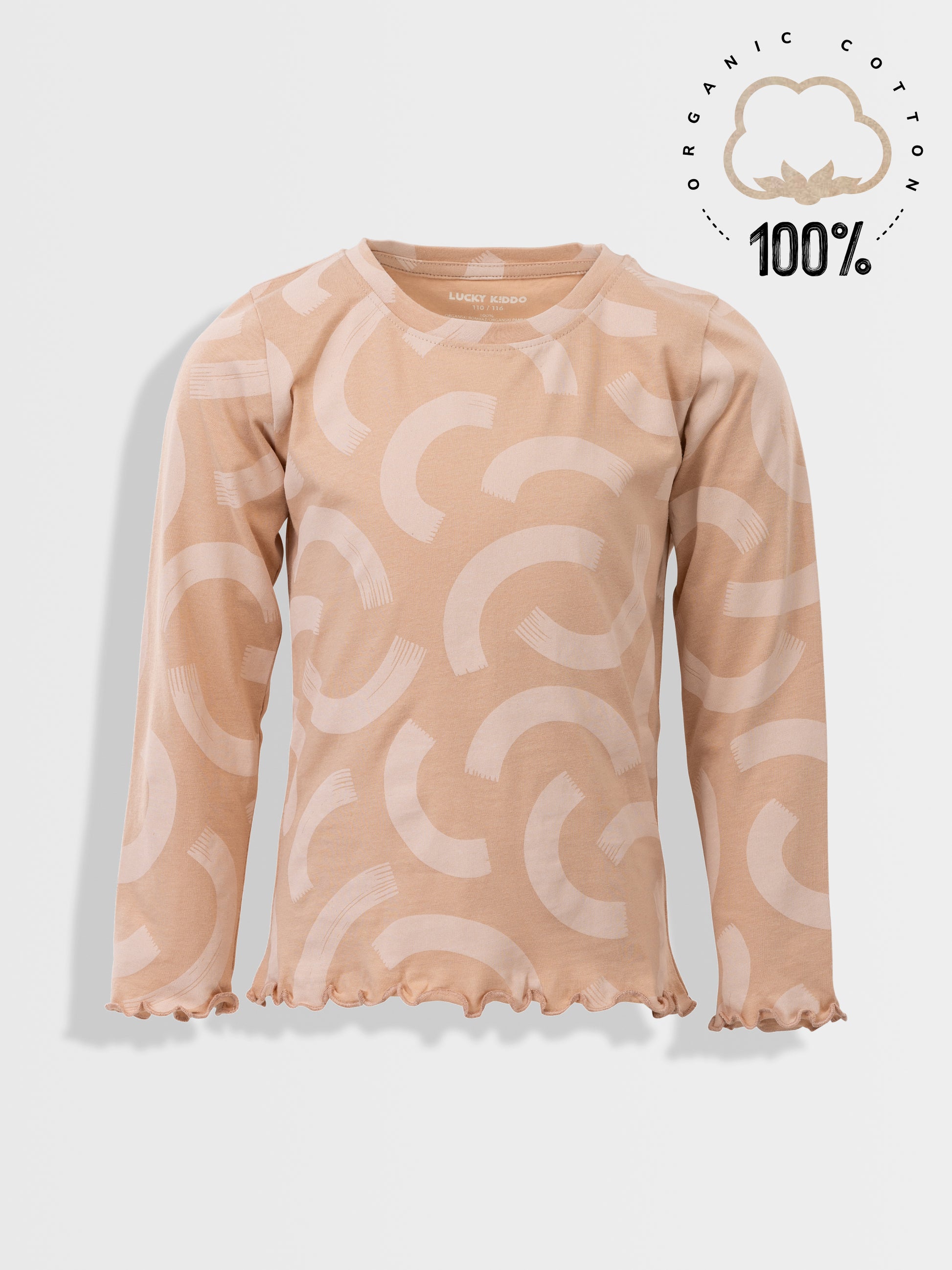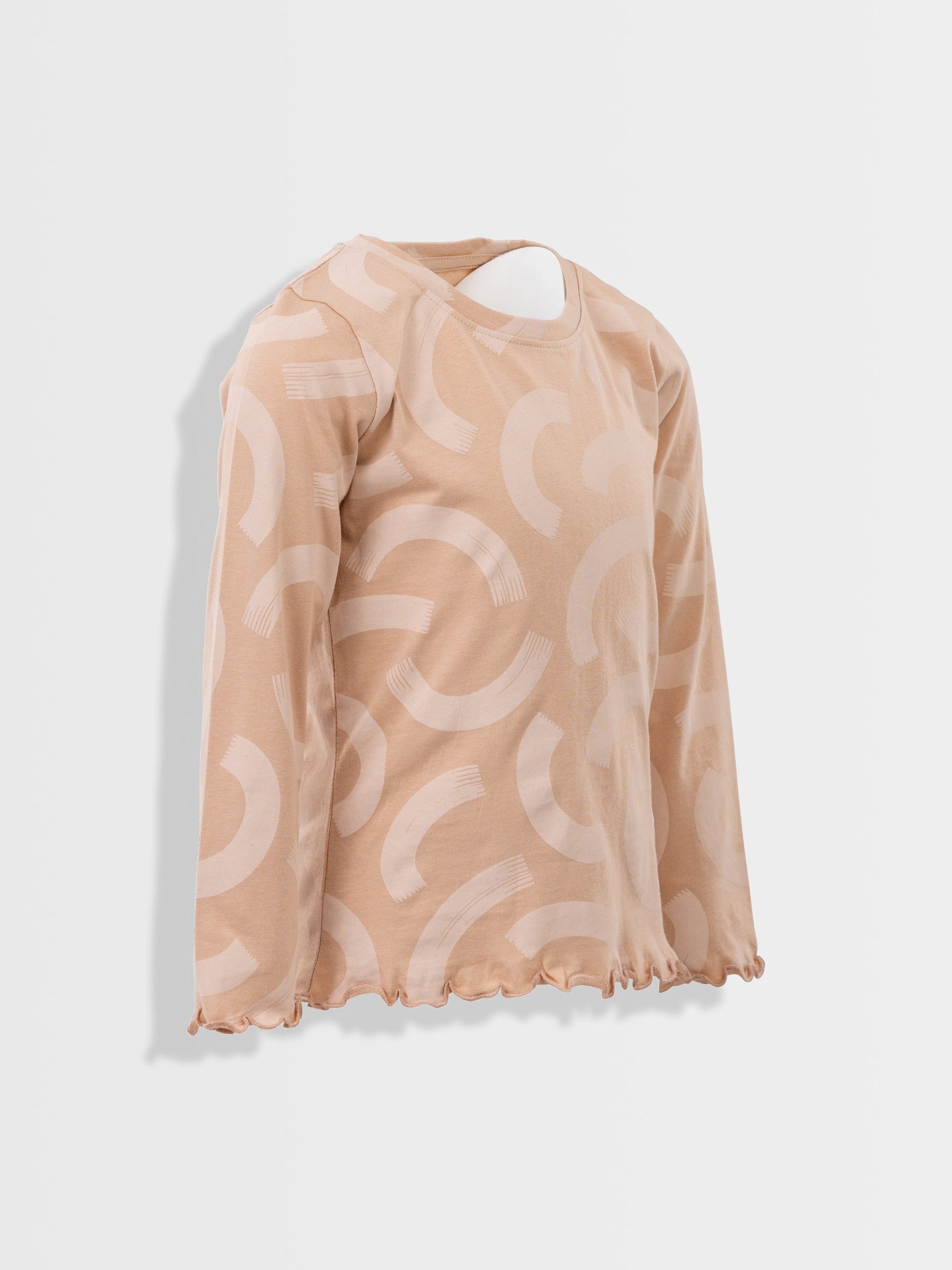 Tričko s dlhým rukávom, jemným volánikom na rukávoch av páse a modernou celoplošnou potlačou.