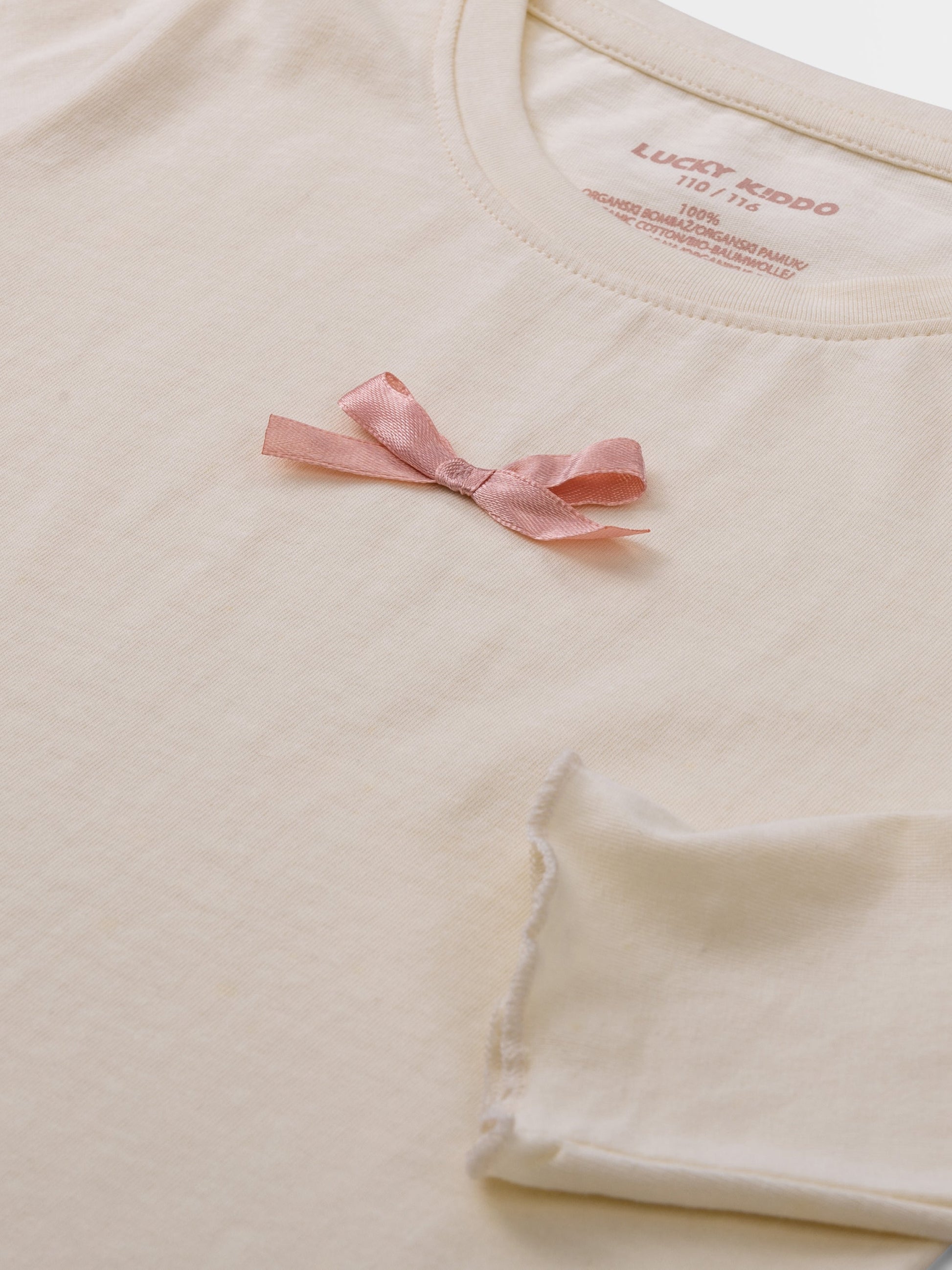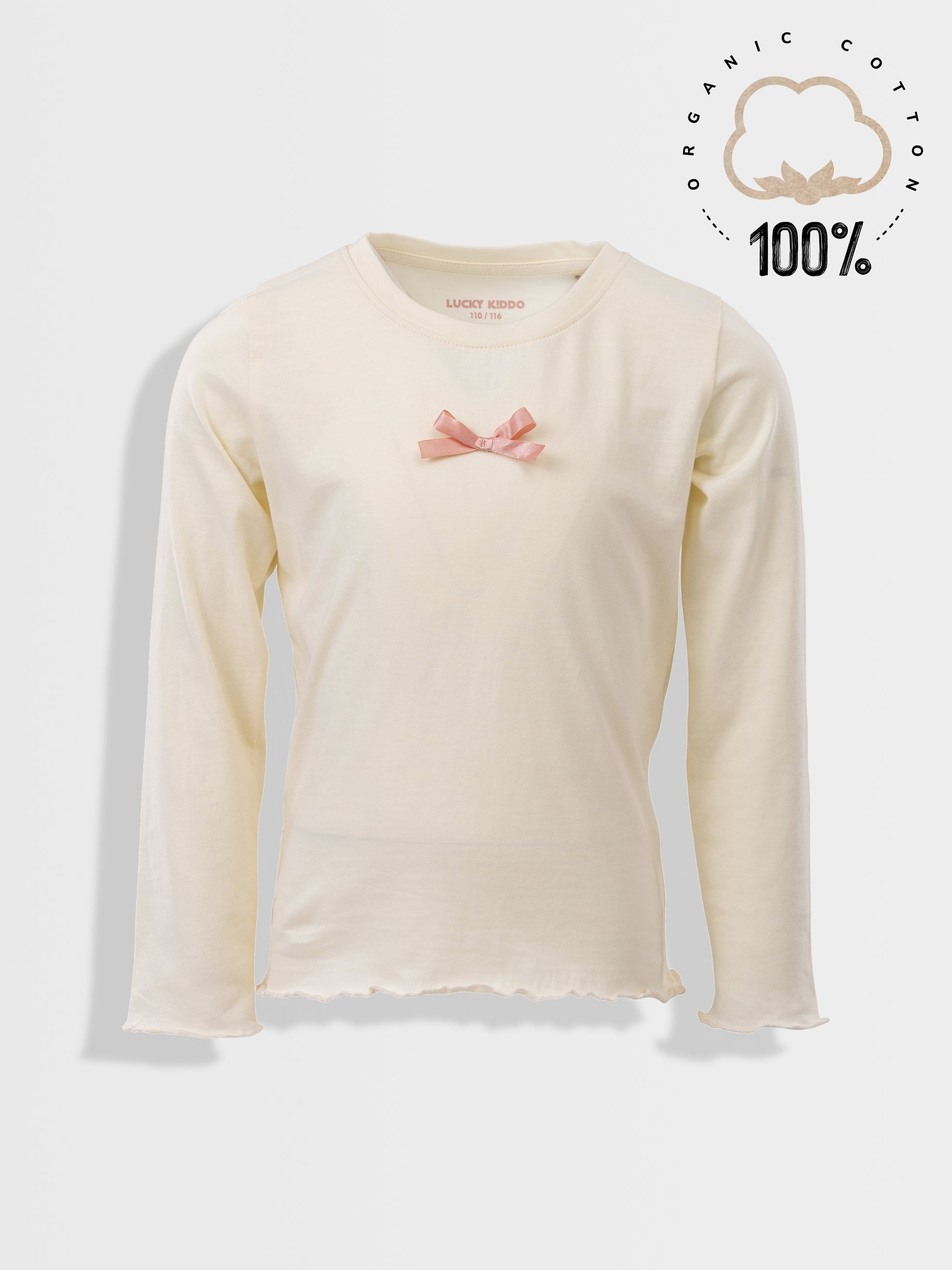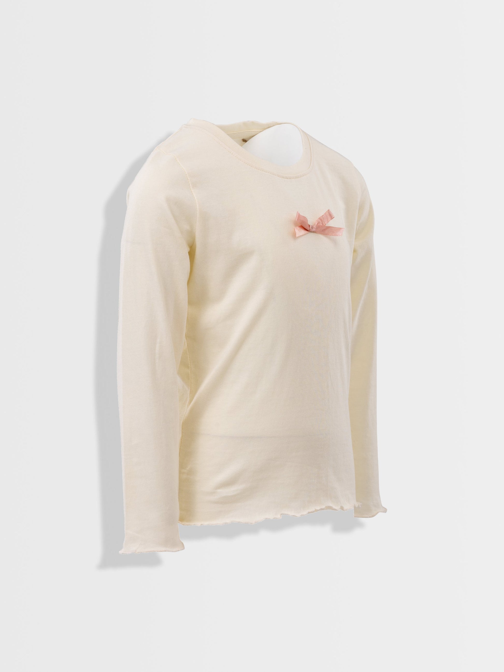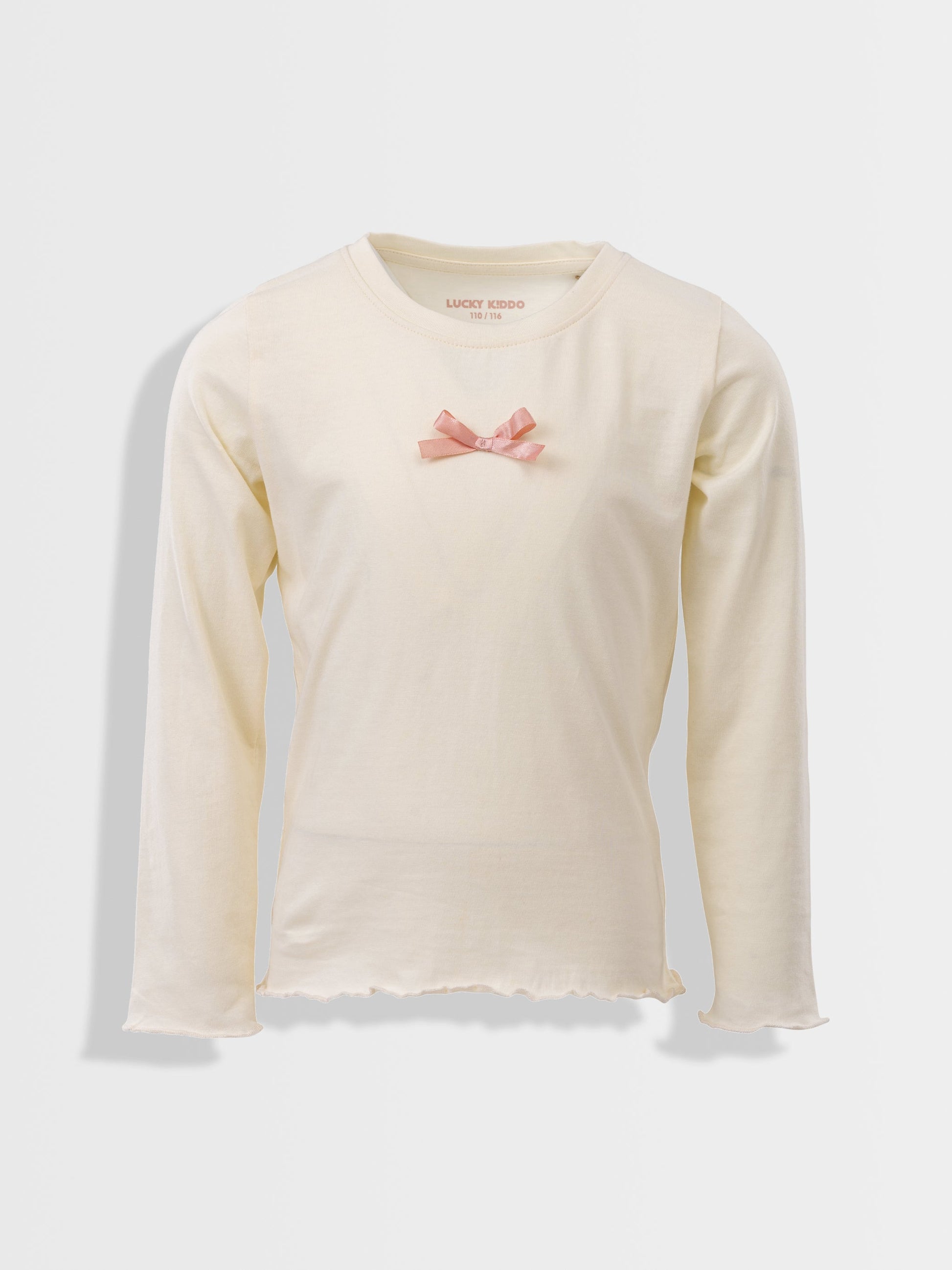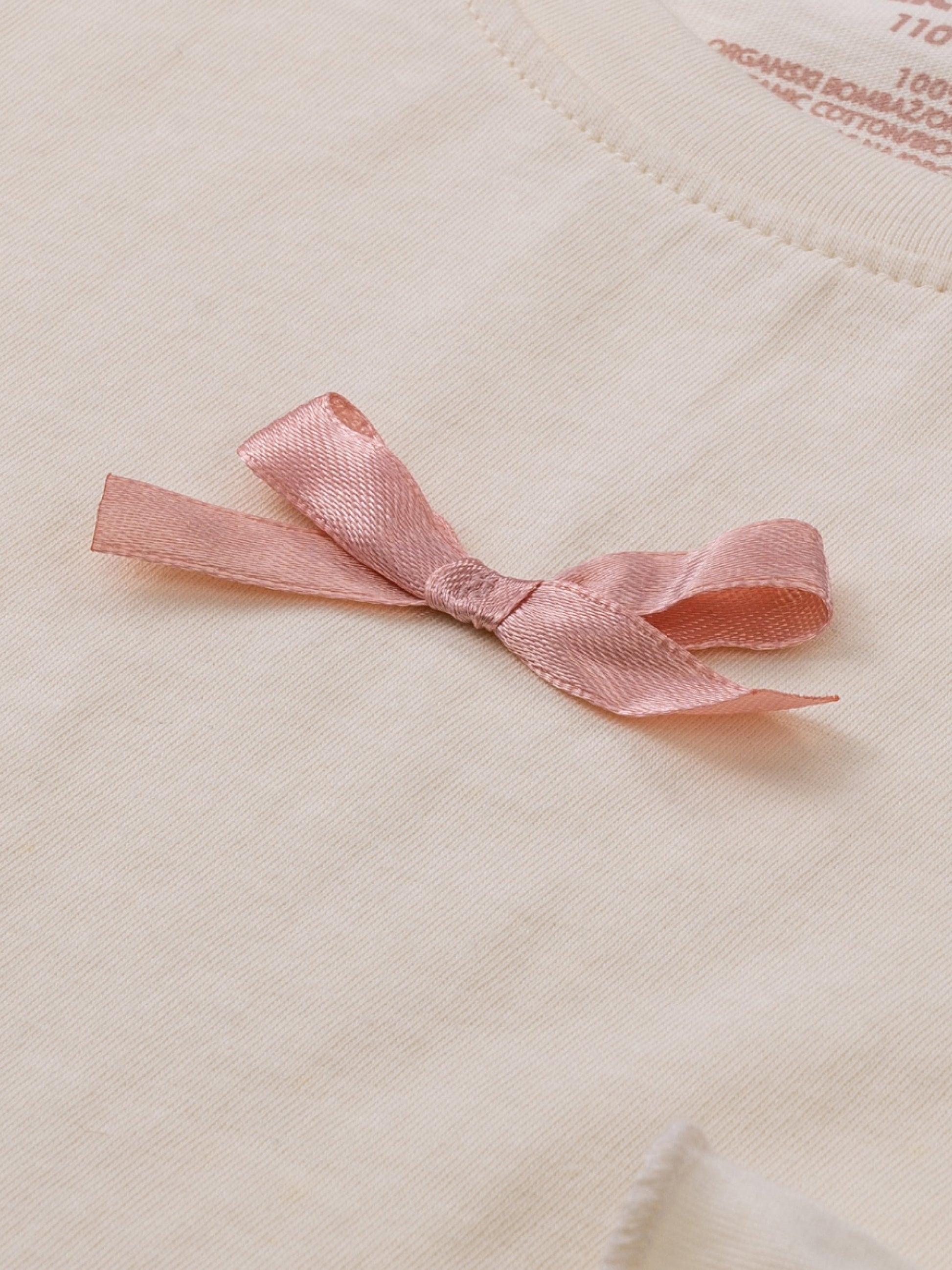 Tričko s dlhým rukávom a jemným volánikom na rukávoch av páse so saténovou mašľou.