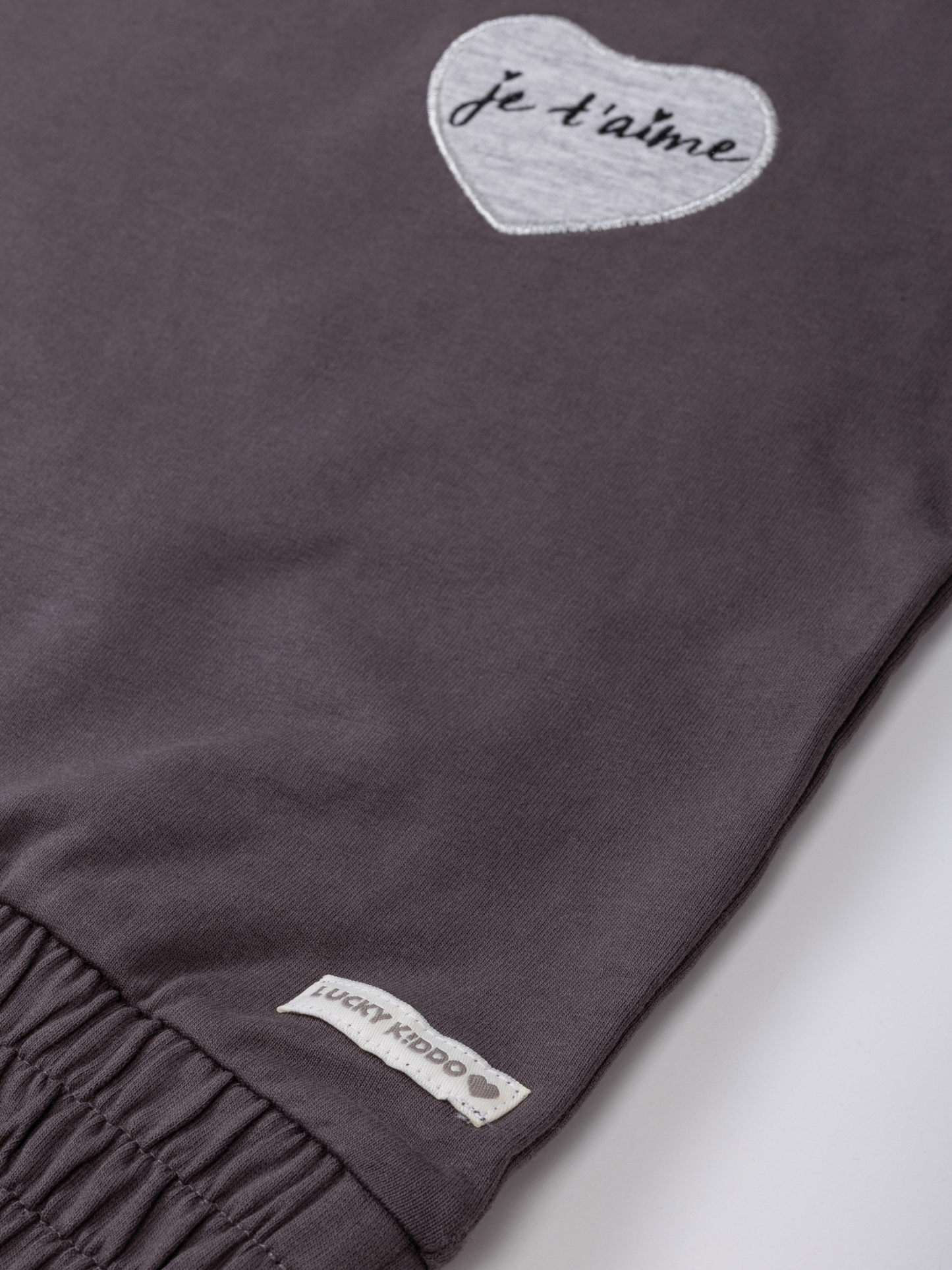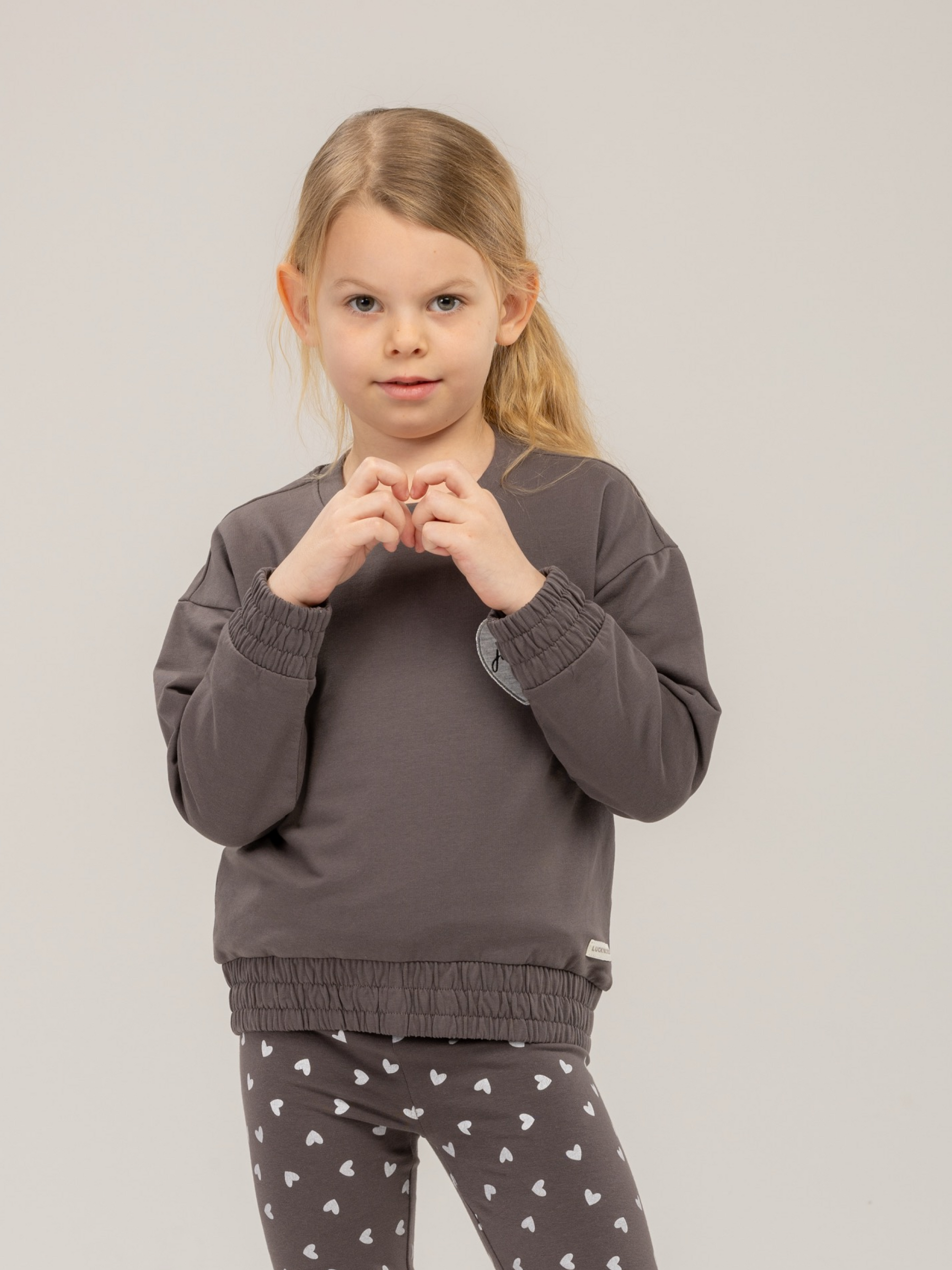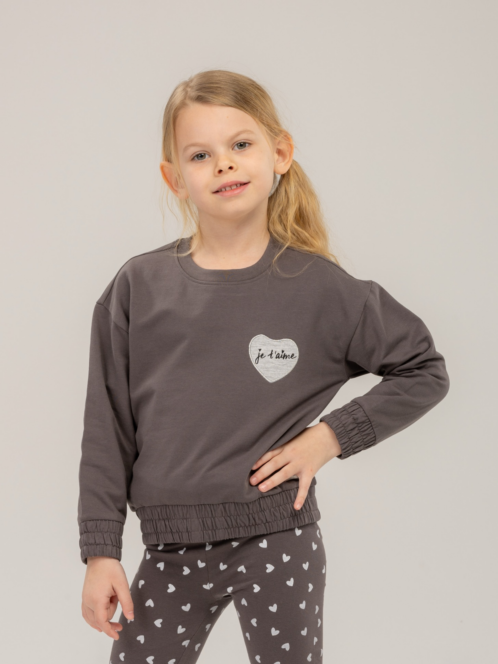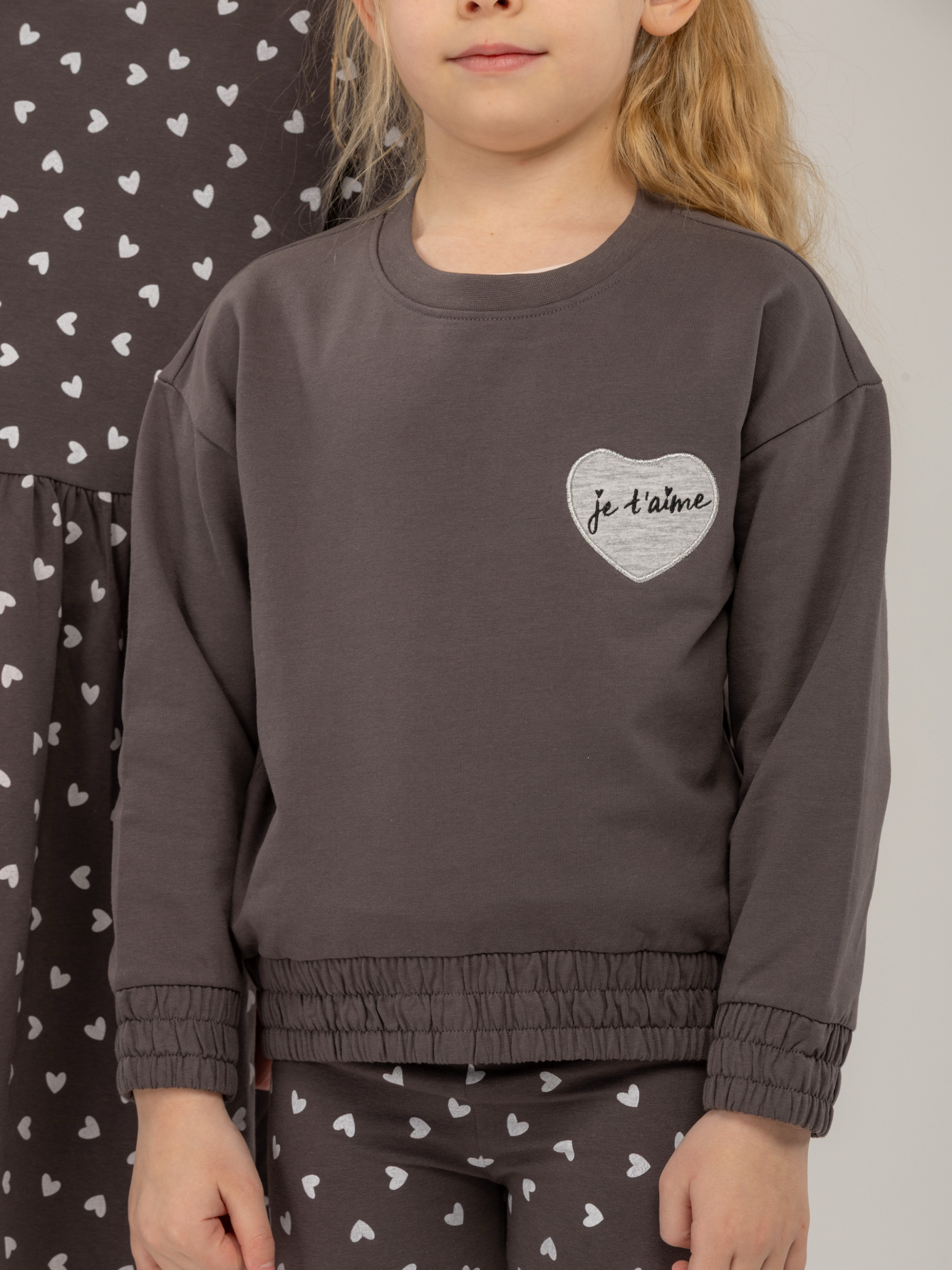 Dievčenský pulóver v tmavosivej farbe s nášivkou v tvare srdca na hrudi.