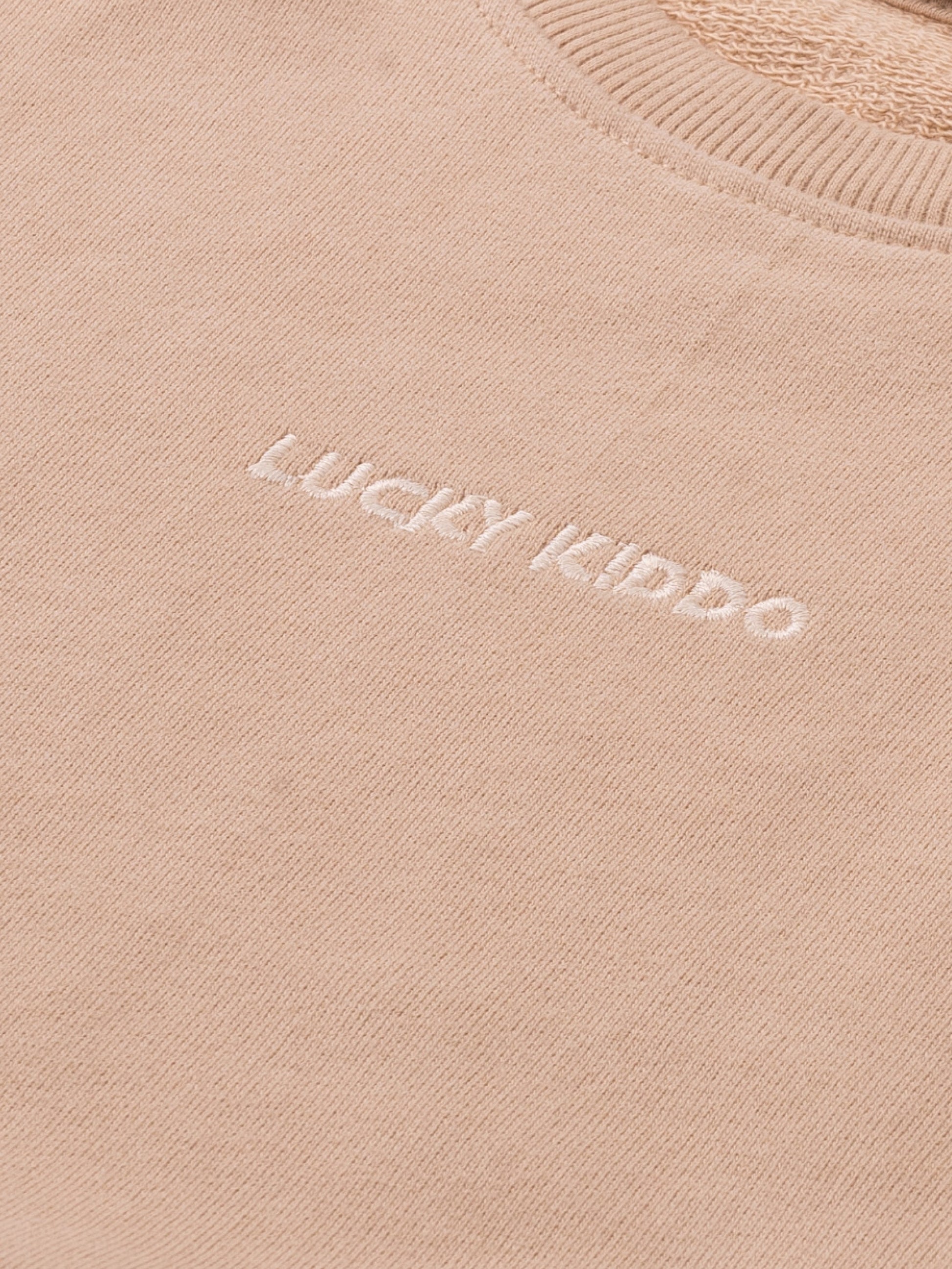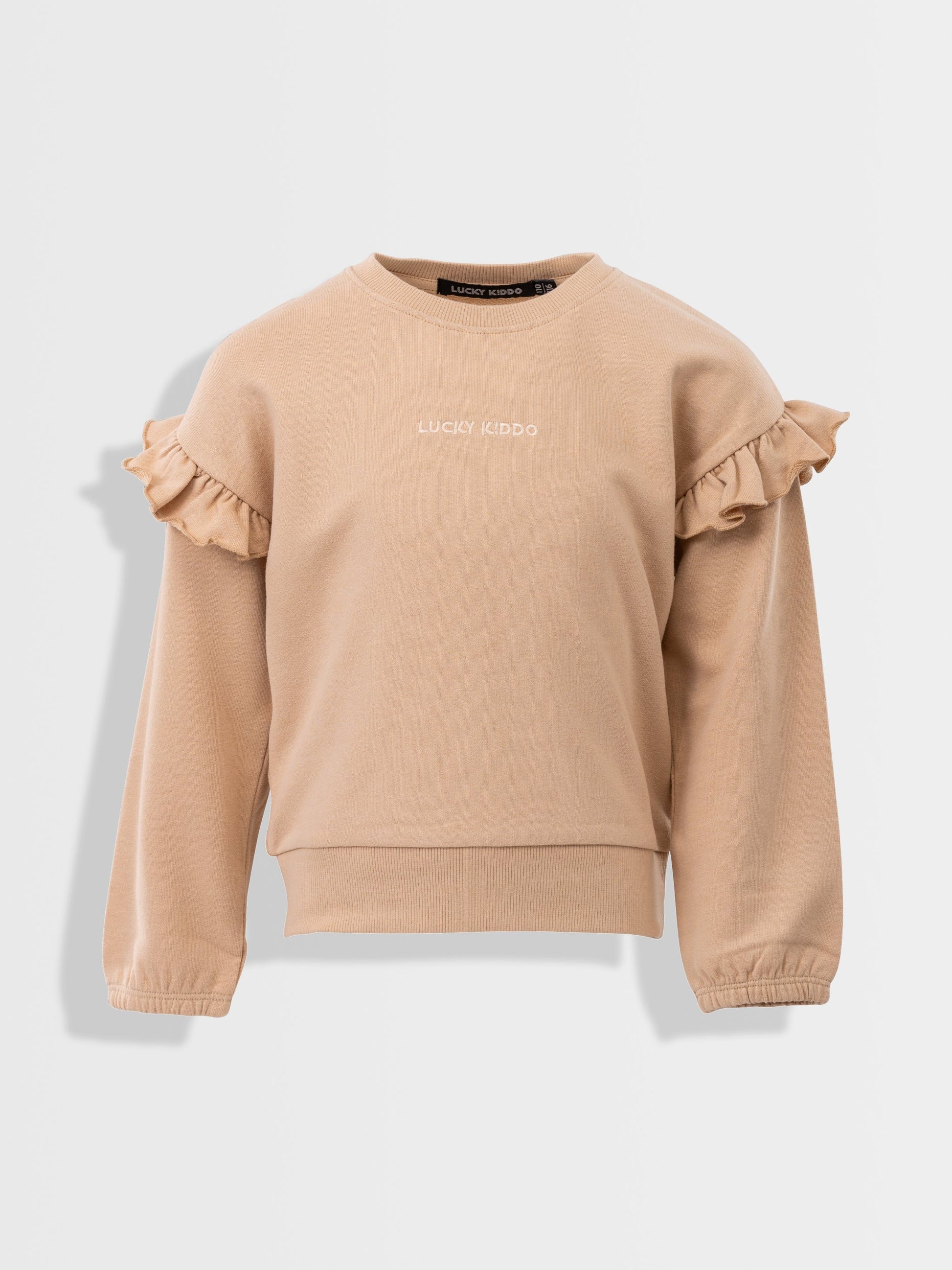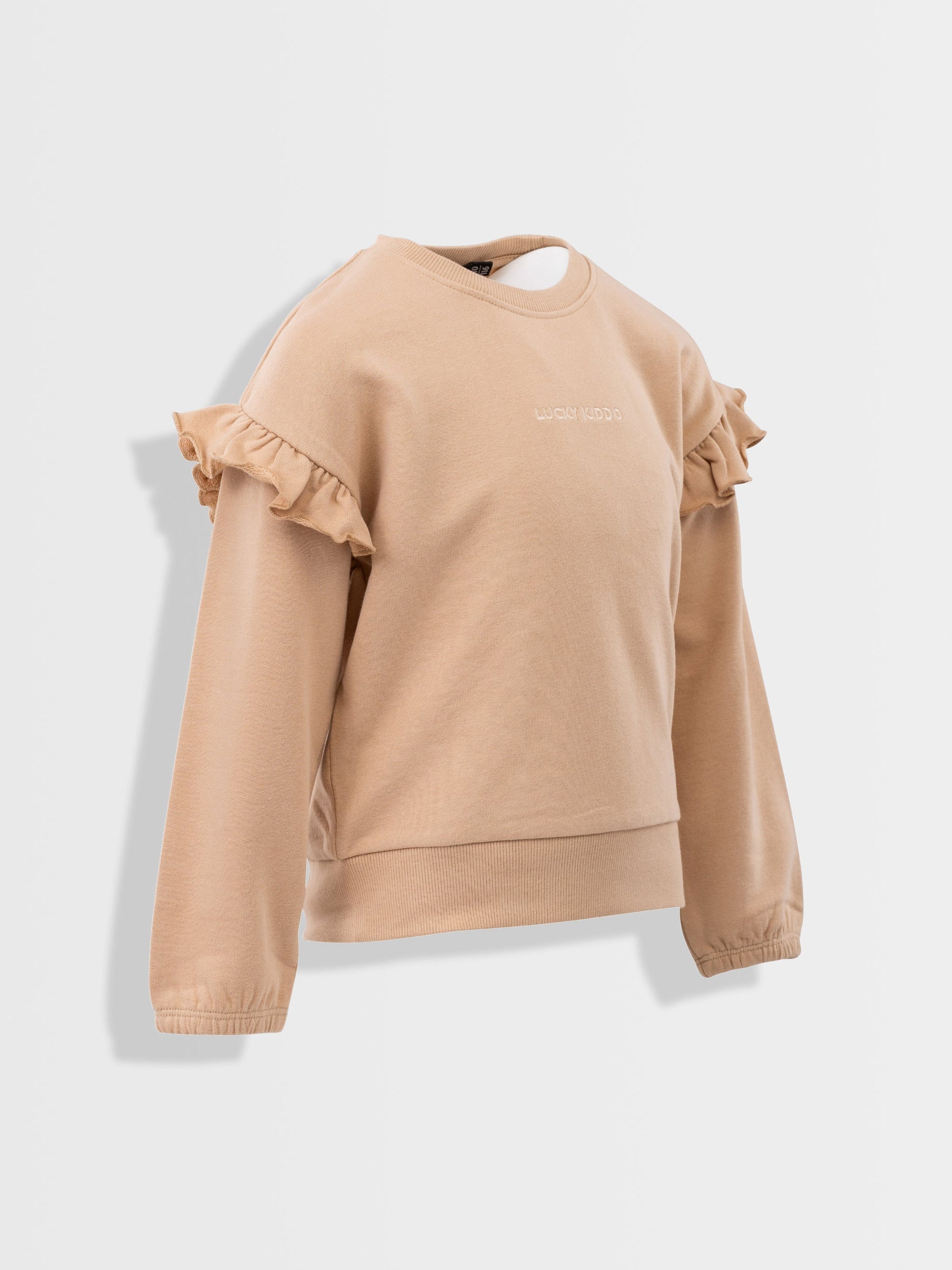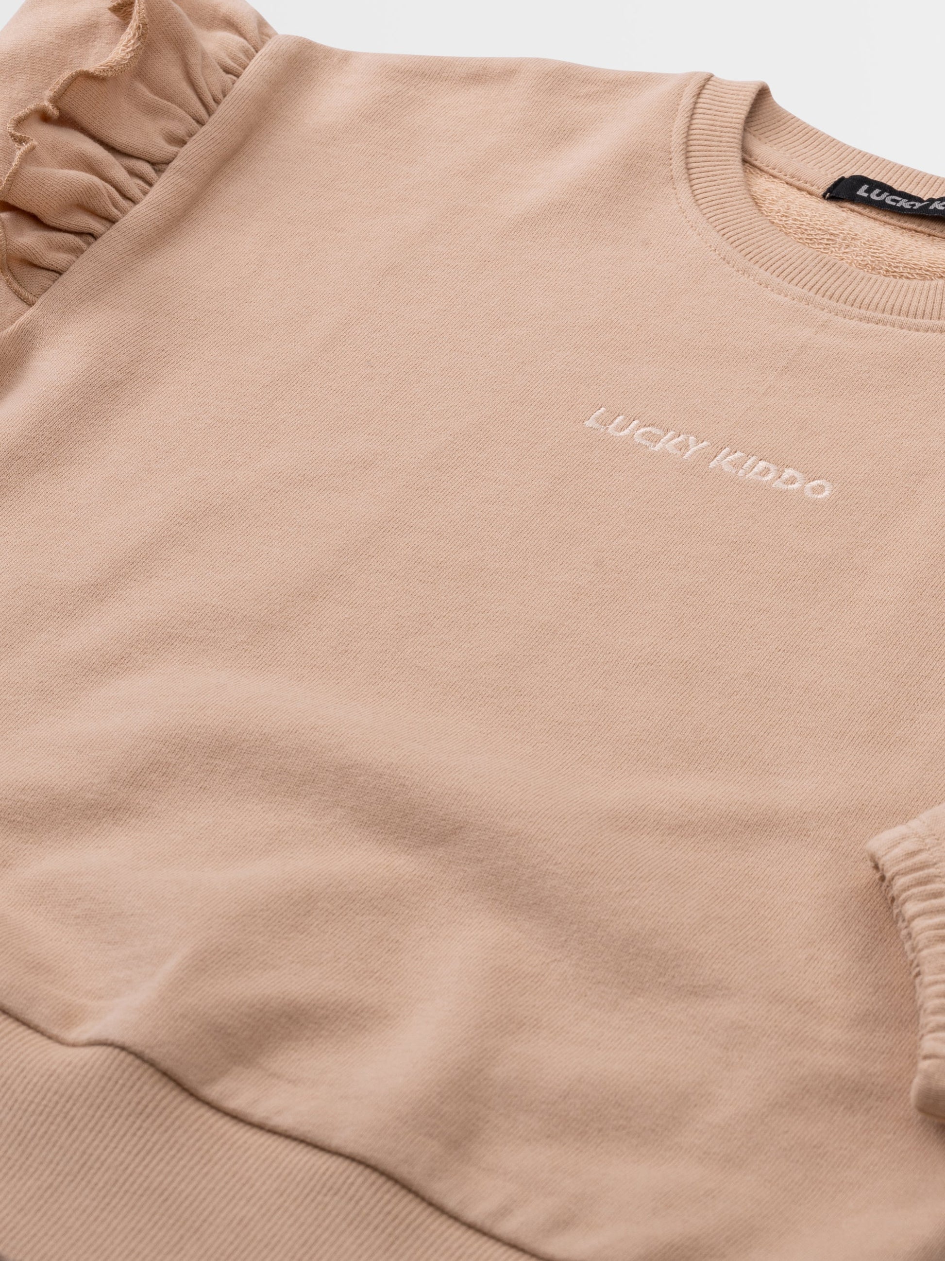 Sveter s krkom s volánikmi na rukávoch a výšivkou Lucky Kiddo