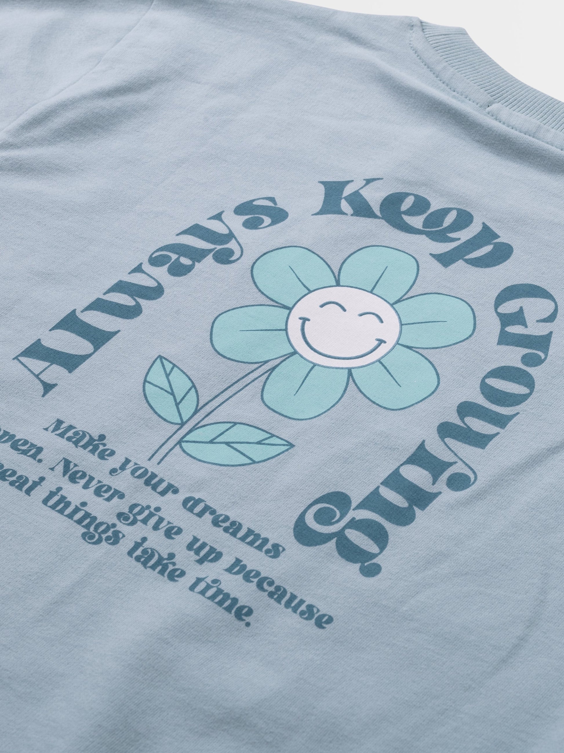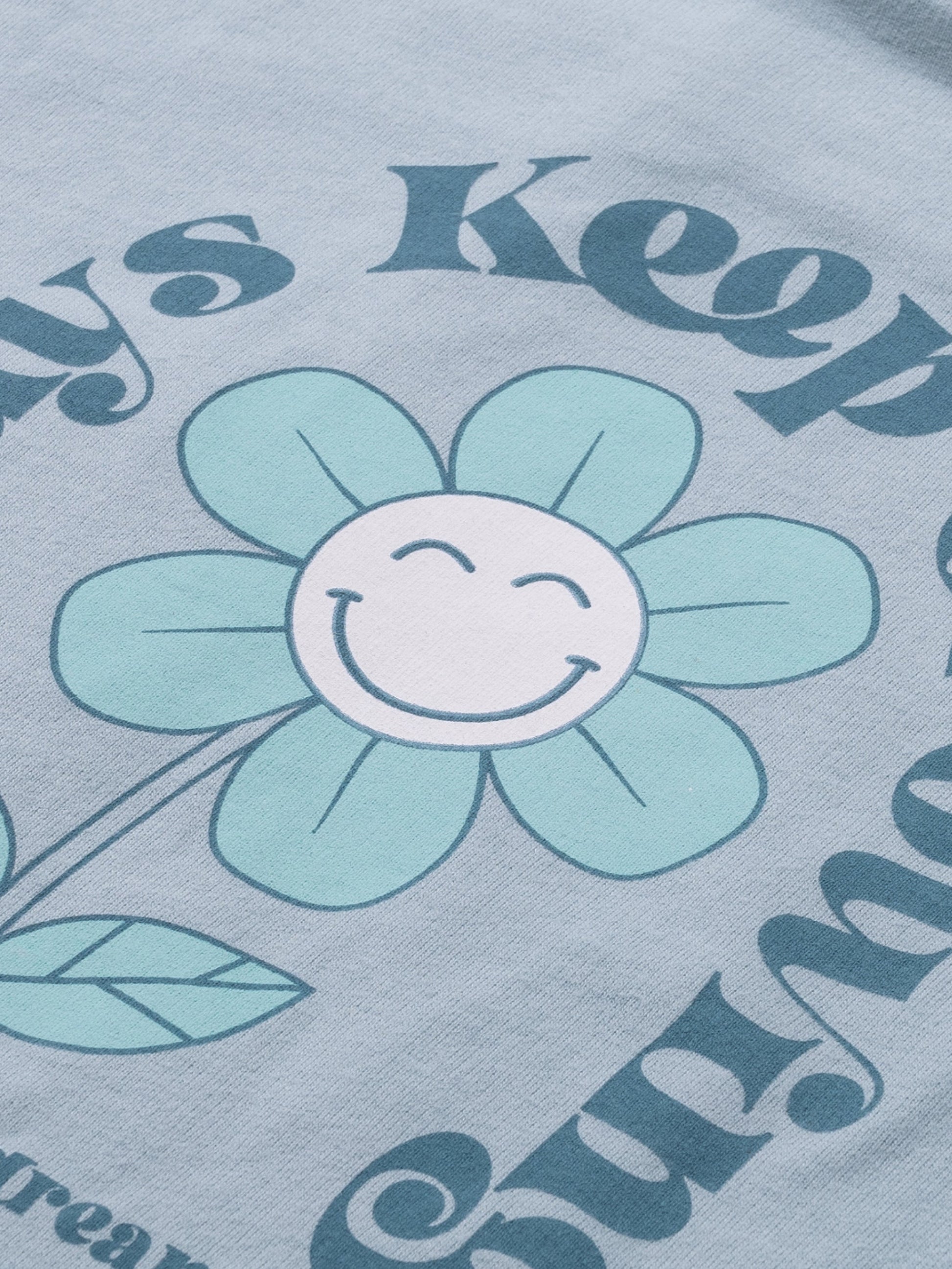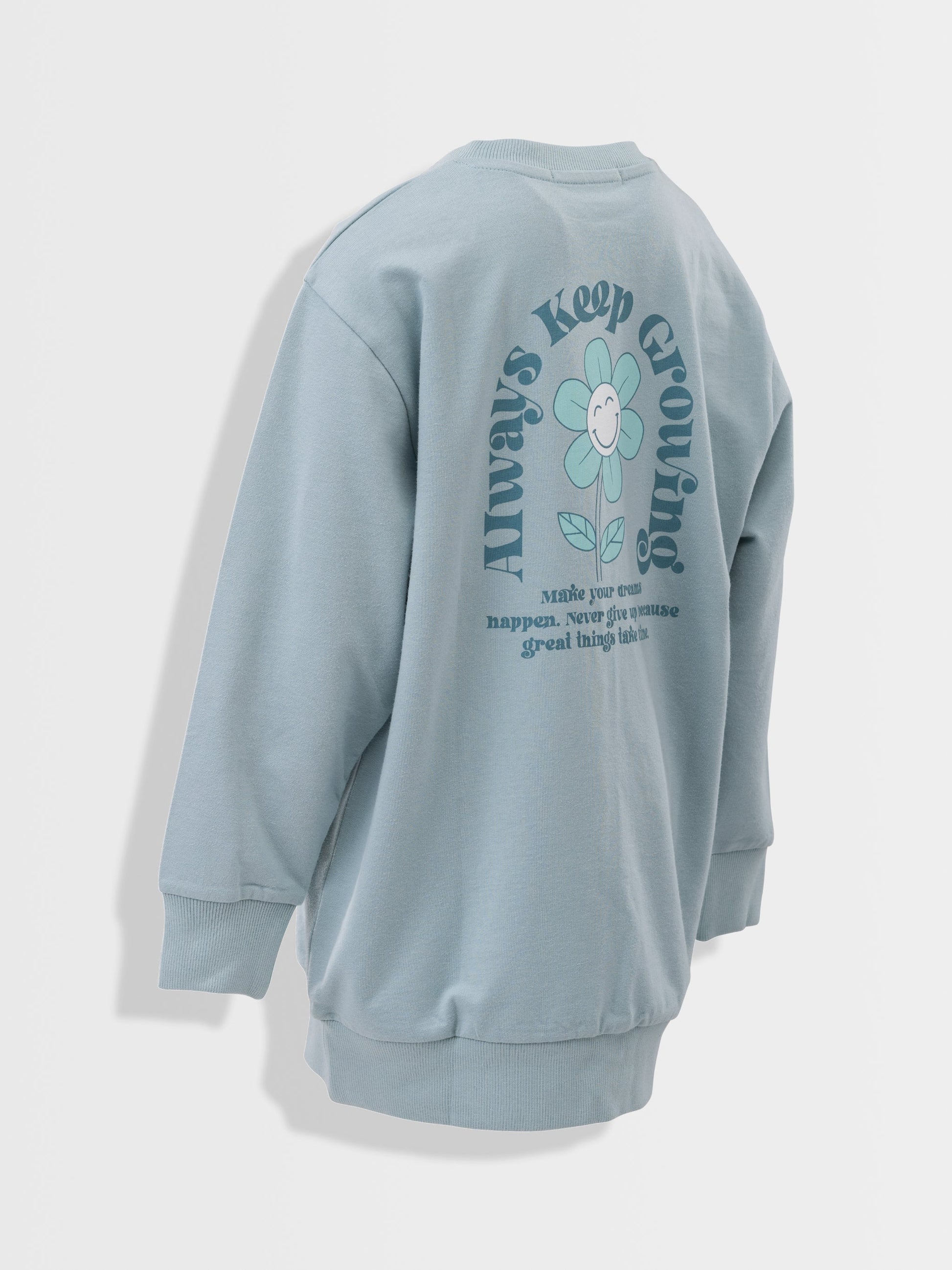Sveter s výstrihom nadmernej veľkosti a roztomilou kvetinovou potlačou na chrbte.