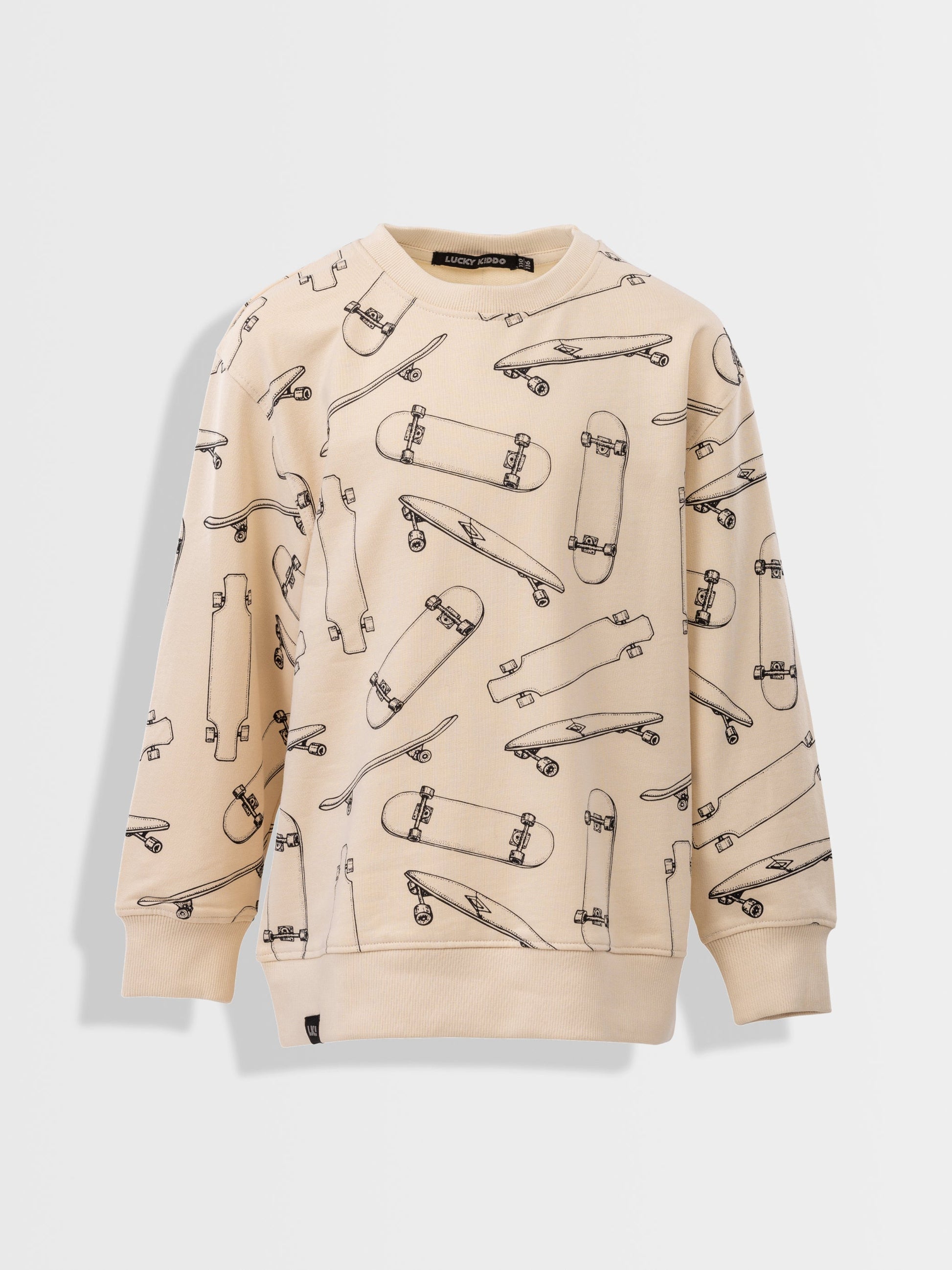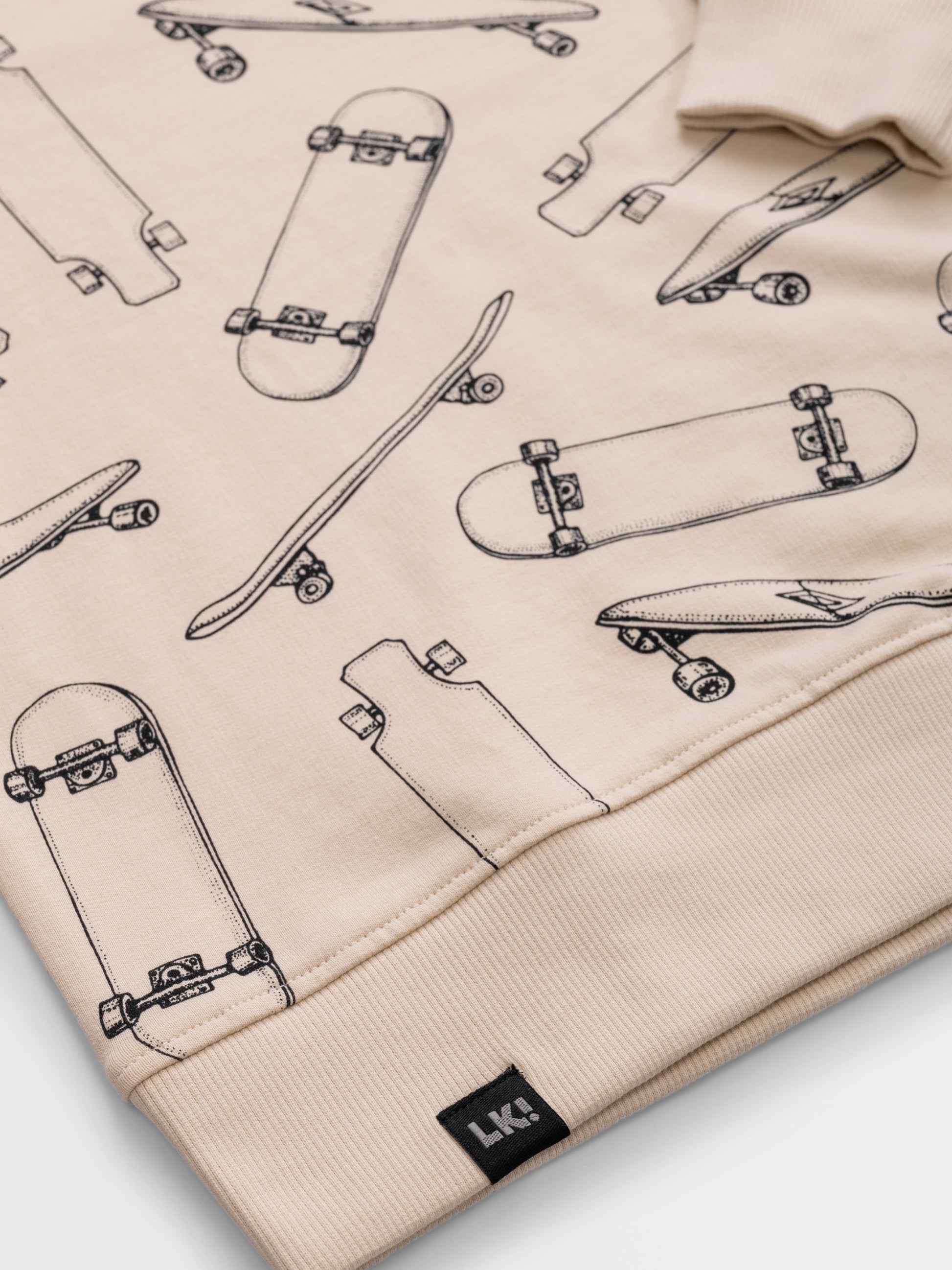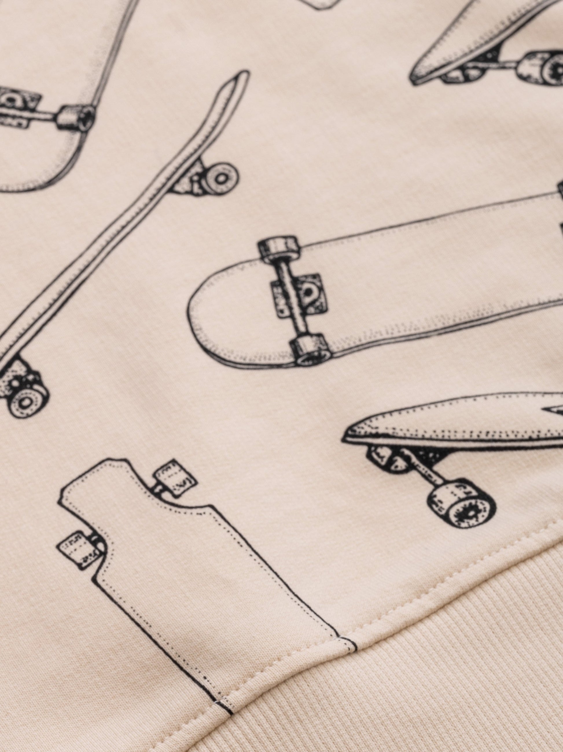 Sveter s výstrihom nadmernej veľkosti s celoplošnou potlačou korčúľ.