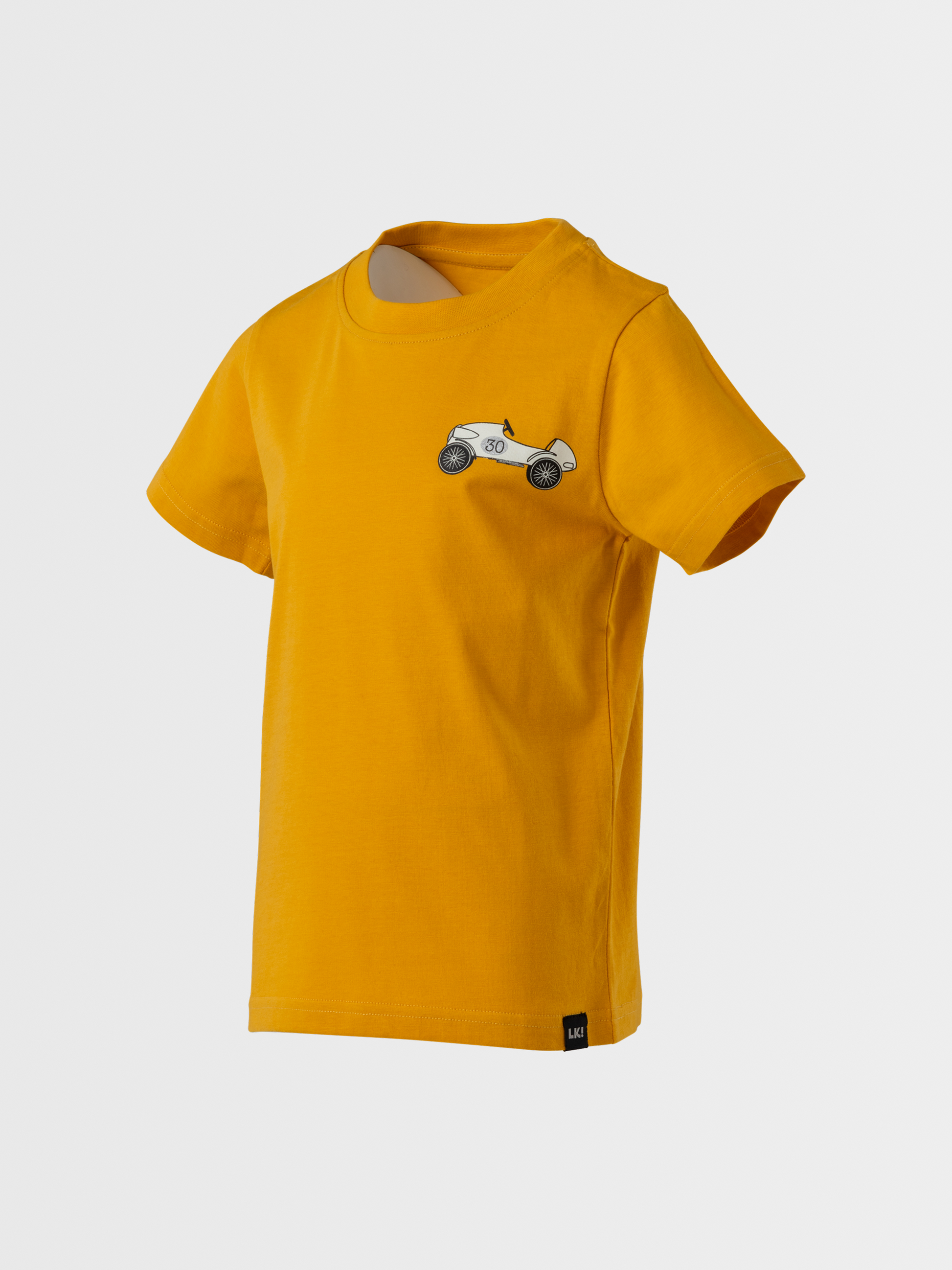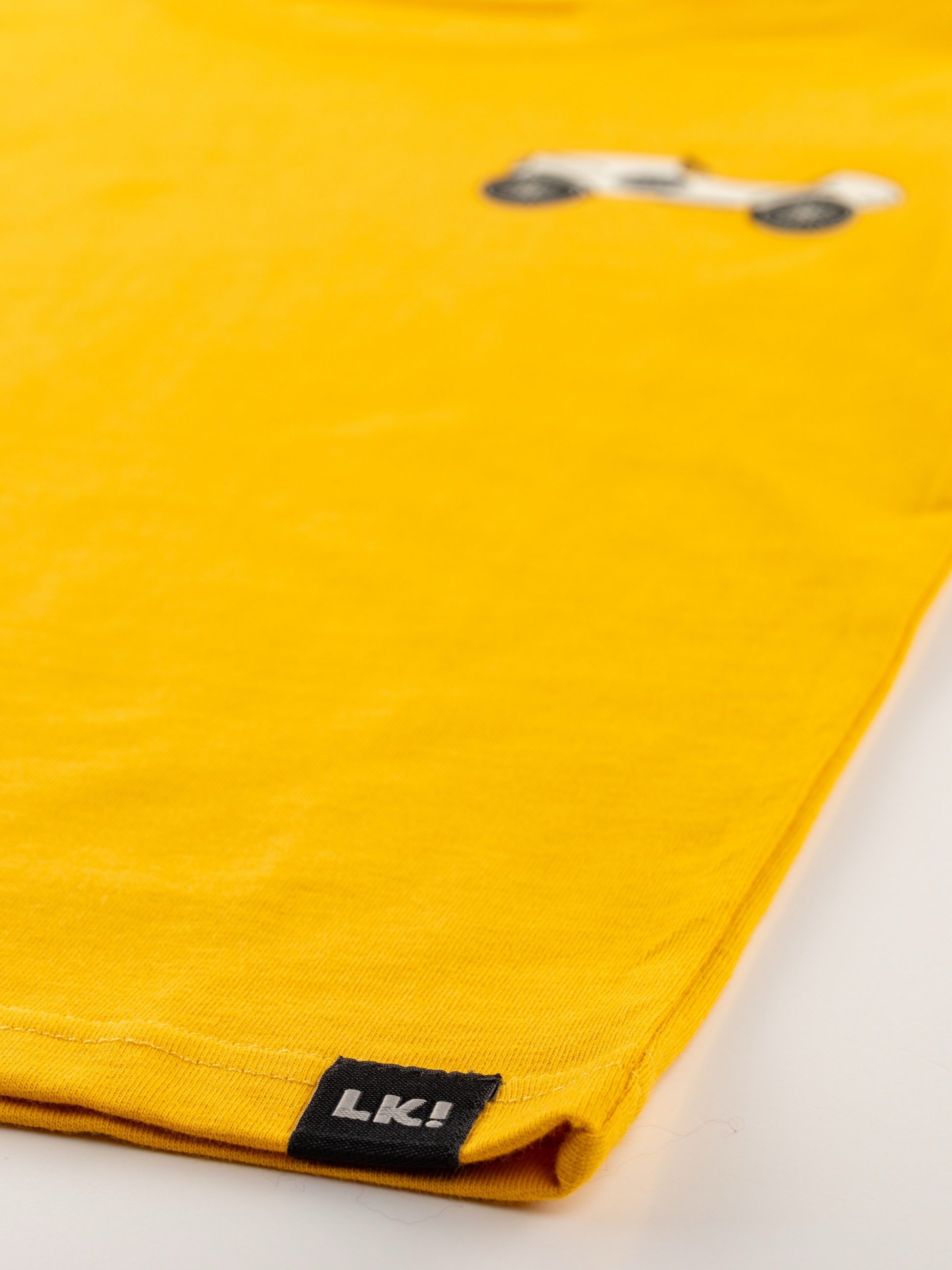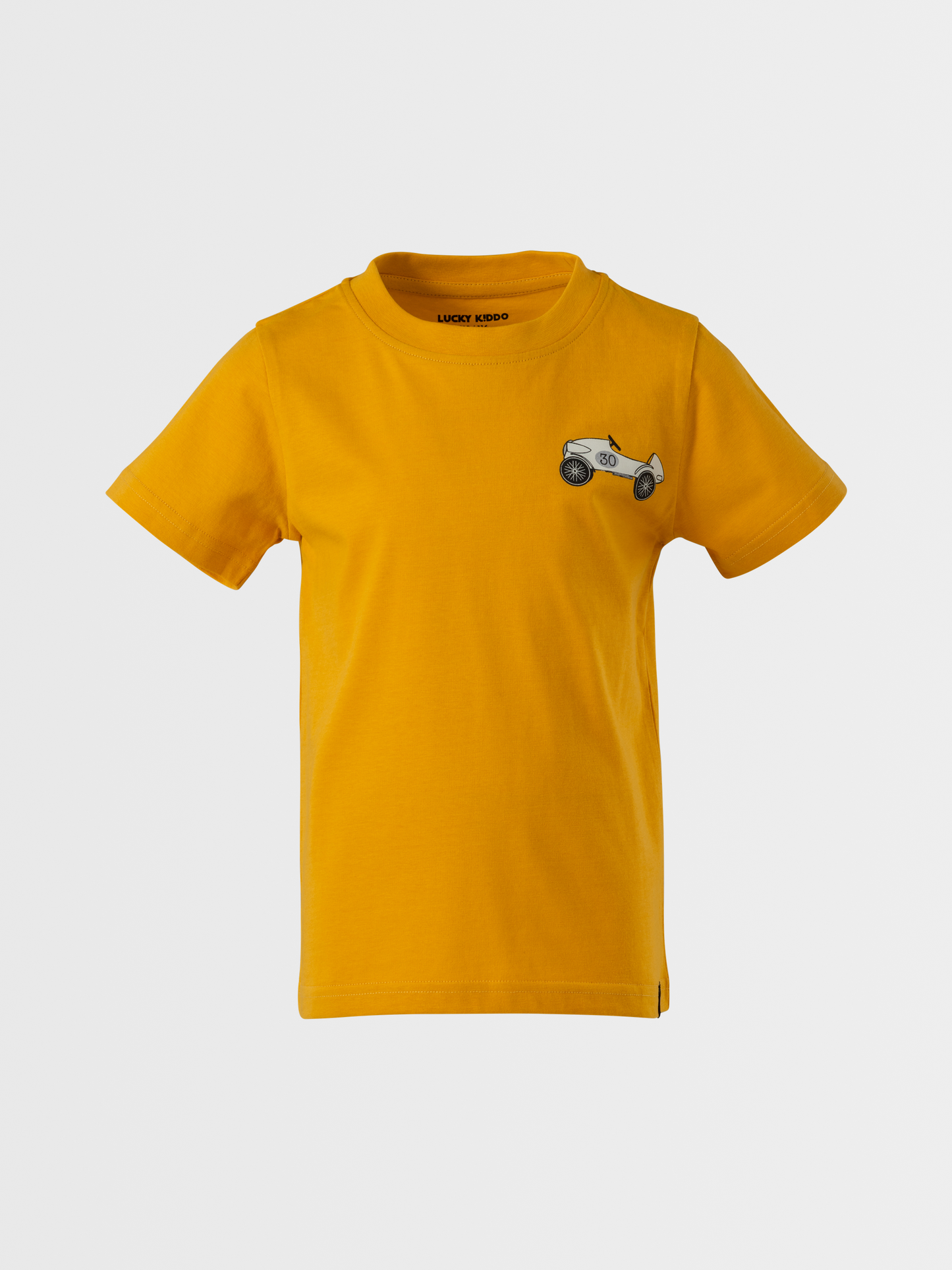 Žlté tričko pre skutočných pretekárov. Bavlnené tričko Lucky Kiddo s minimalistickou potlačou retro pretekárskeho auta je tou správnou voľbou pre každého nadšenca.