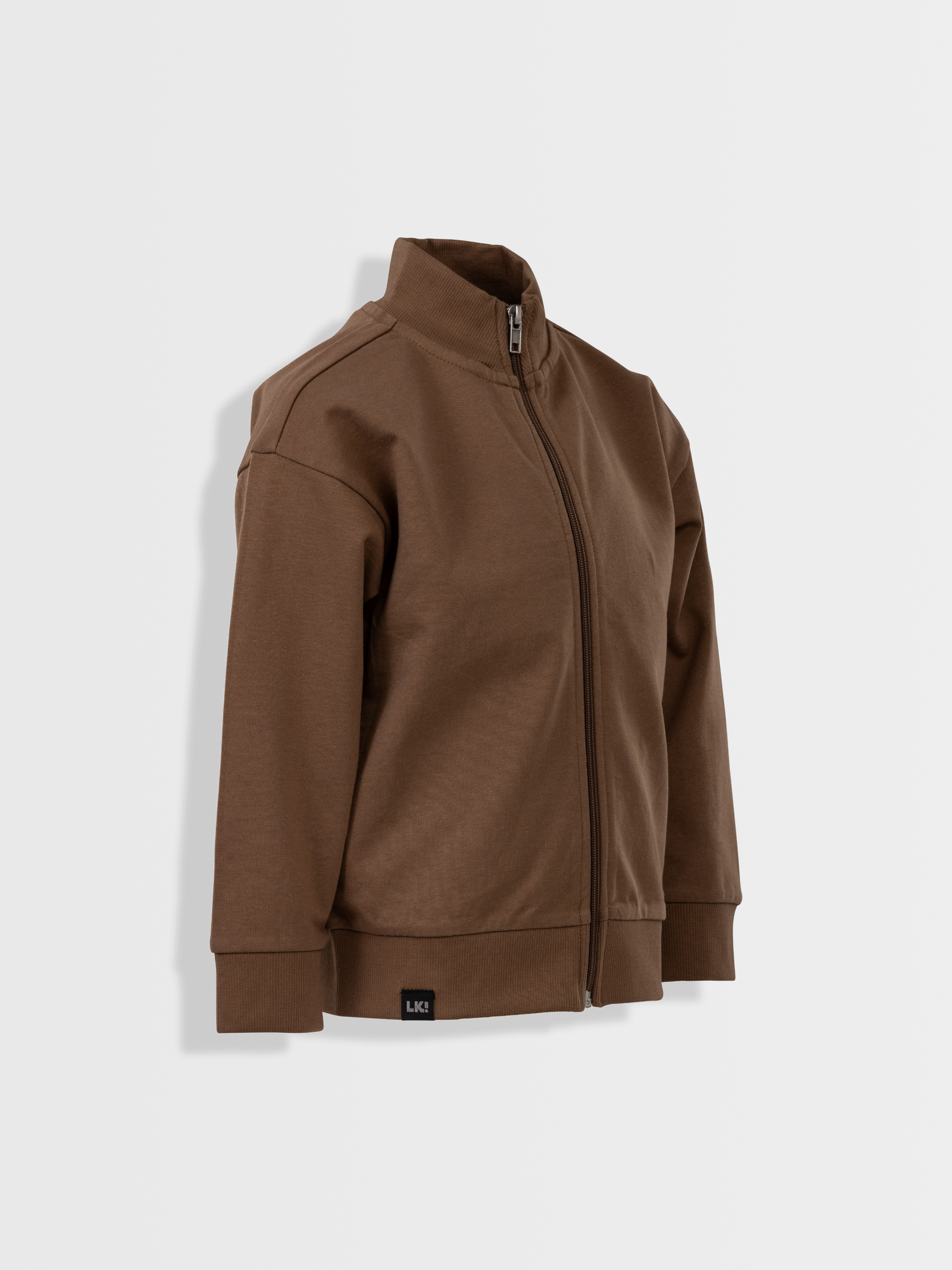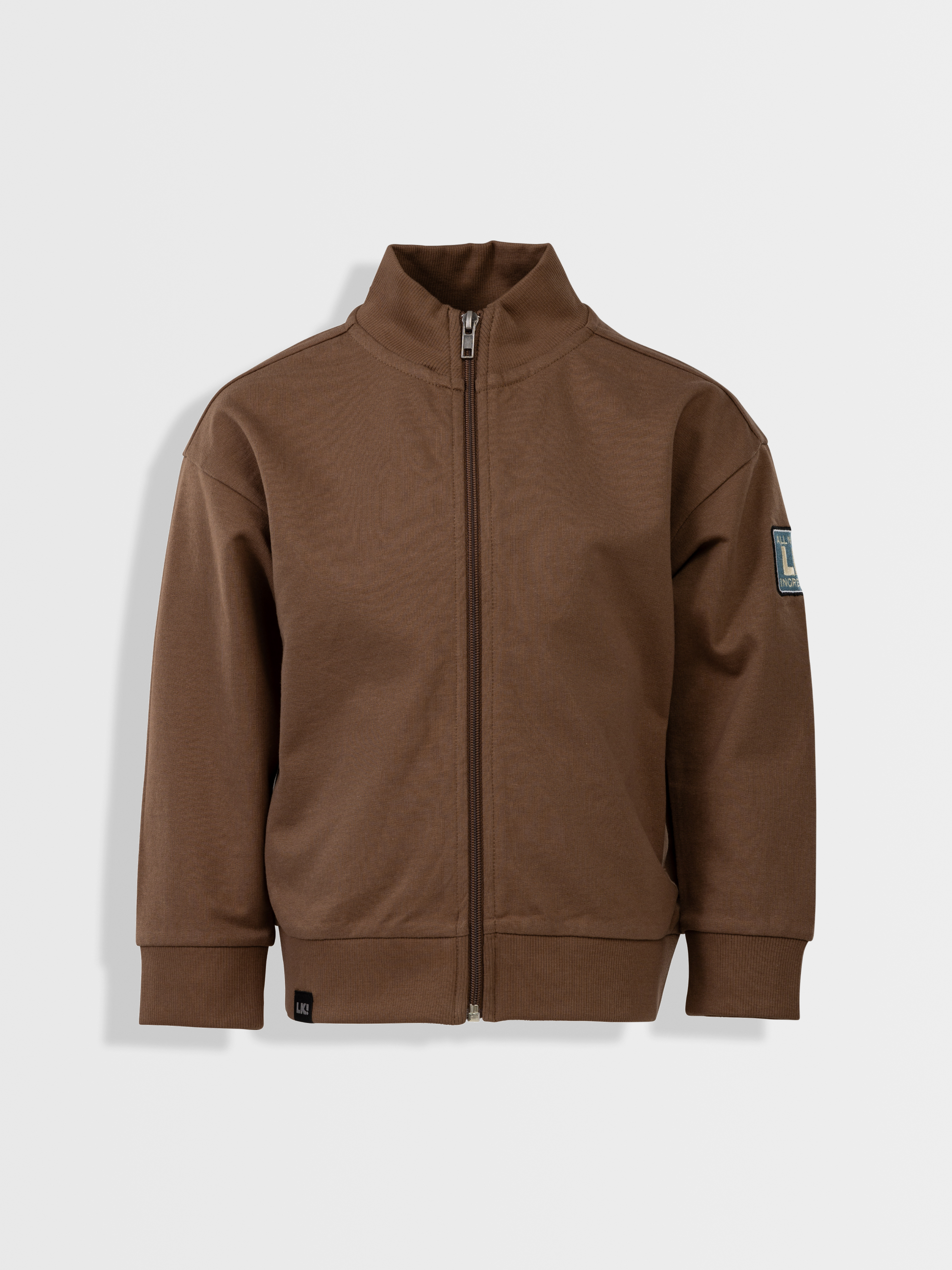 Chlapčenská mikina na zips v hnedej farbe s moderným dizajnom a nášivkou na ruke.