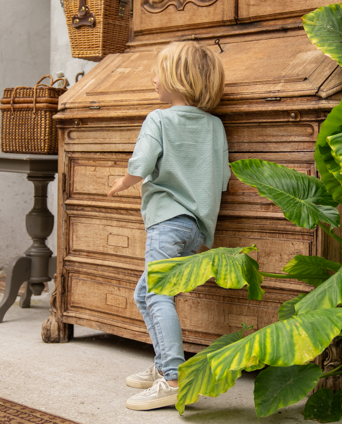 Chlapčenské tričko Lucky Kiddo v jemnej modrej farbe je ideálnou voľbou pre malých prieskumníkov. Vyrobené zo 100 % prírodnej bavlny, je mimoriadne mäkké a šetrné k pokožke. Dodatočný šarm jej dodáva jemná textúra a roztomilé predné vrecko, ktoré jej dodáva nádych hravosti a praktickosti. Ideálne na každý deň – na bežné hranie, do školy alebo na špeciálne príležitosti!