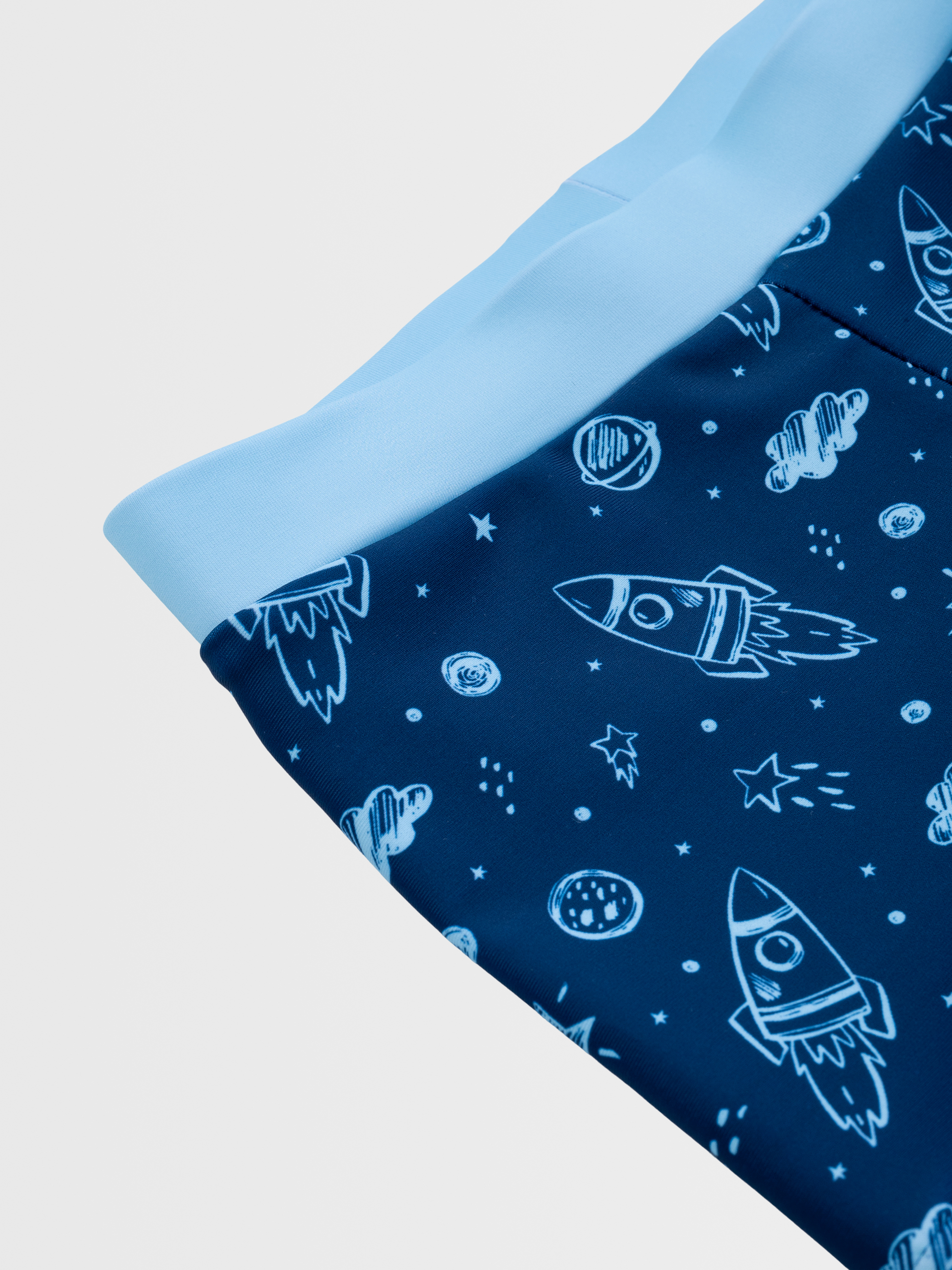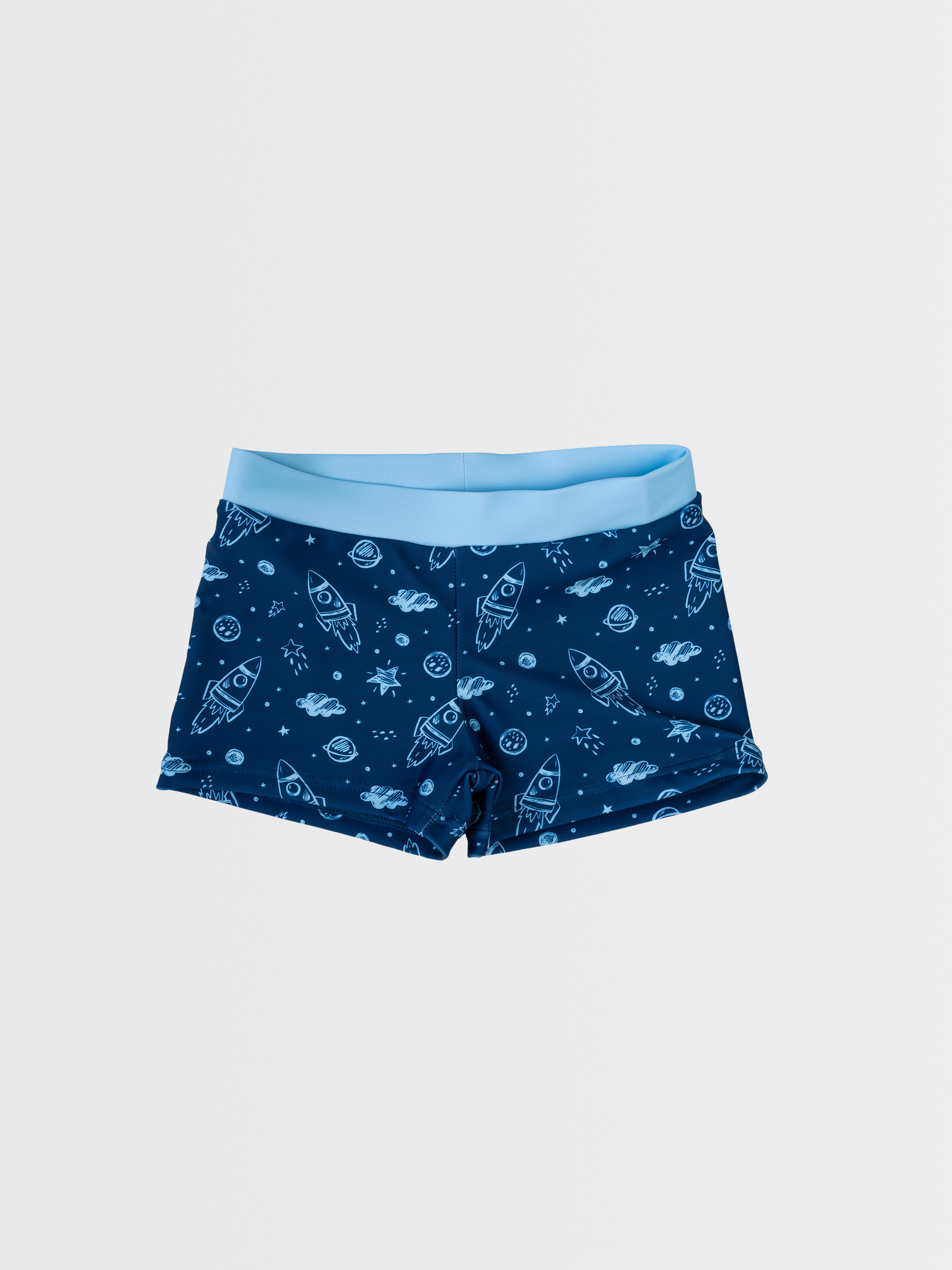 Chlapčenské boxerkové plavky v tmavomodrej farbe s vesmírnou potlačou – ideálna voľba pre mladých objaviteľov a nadšencov cestovania.