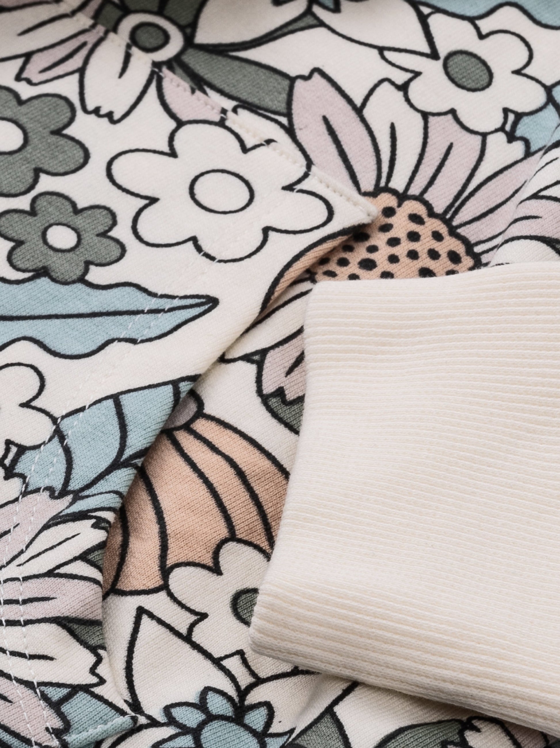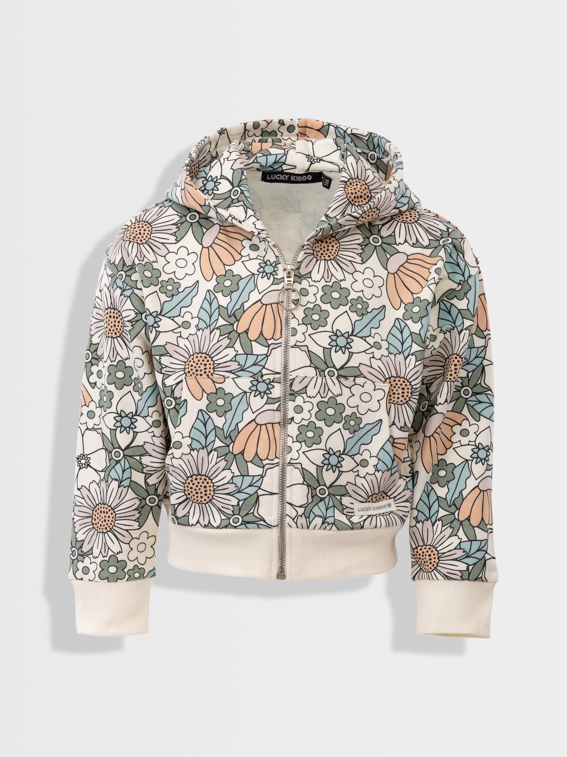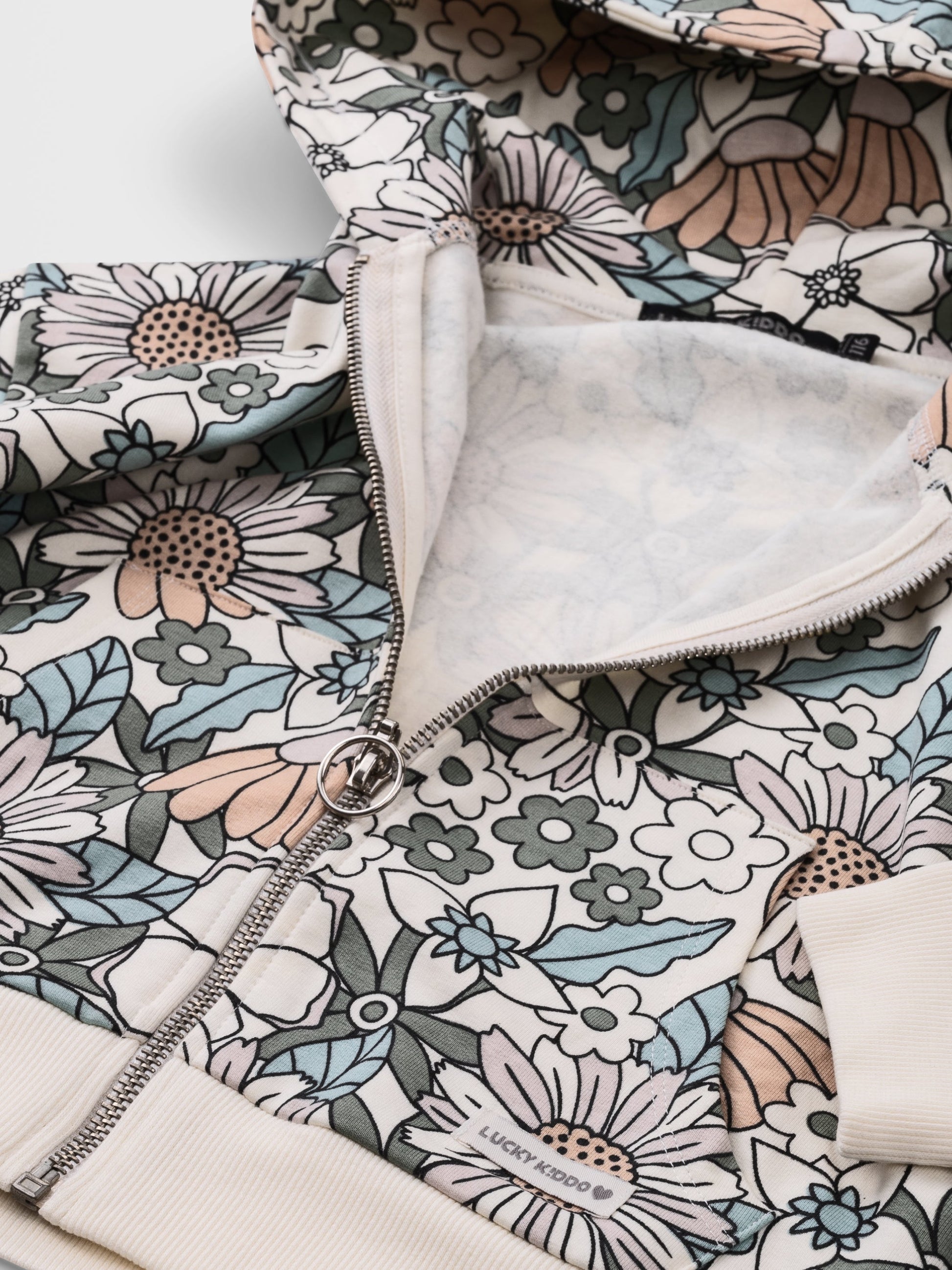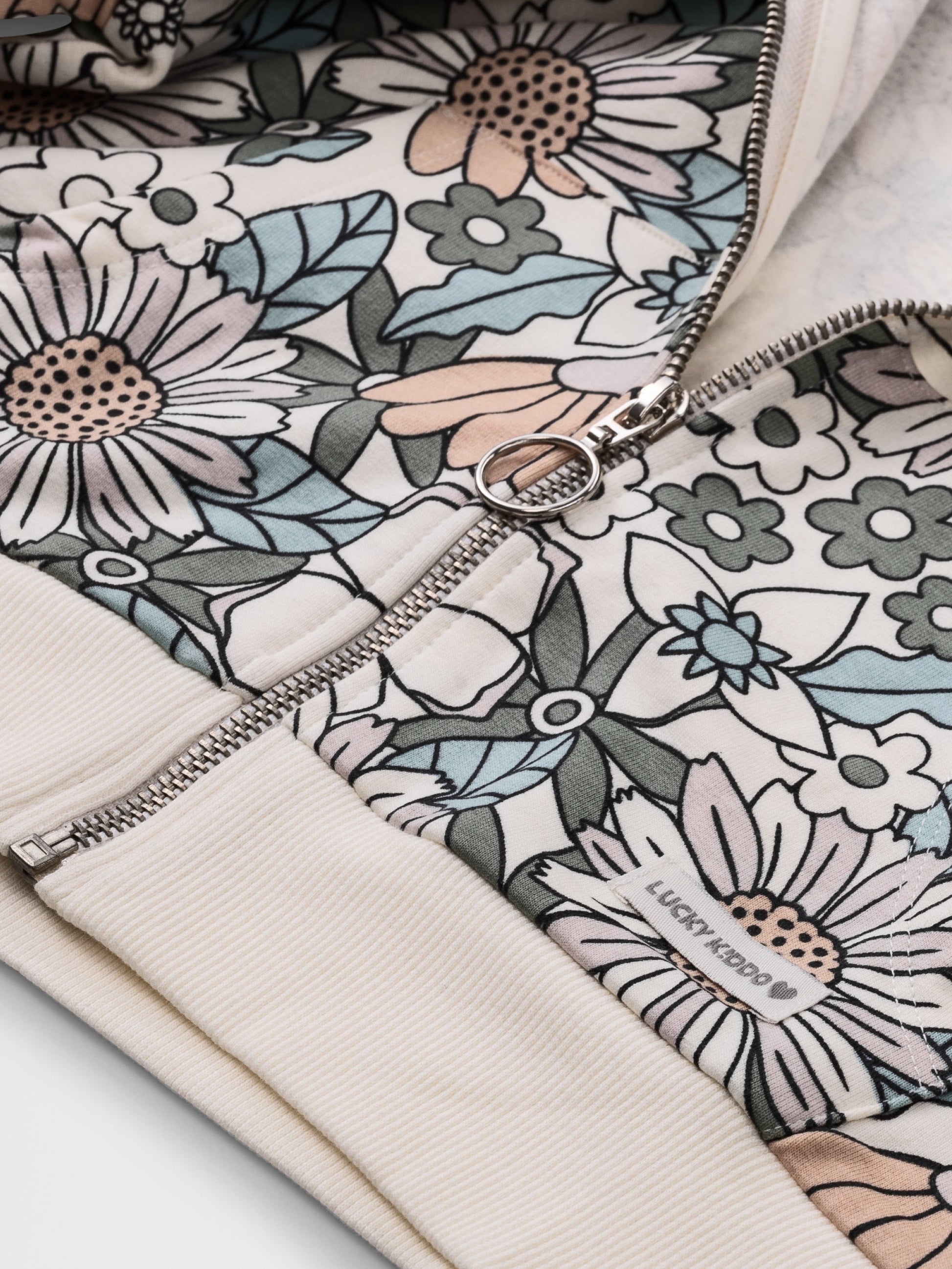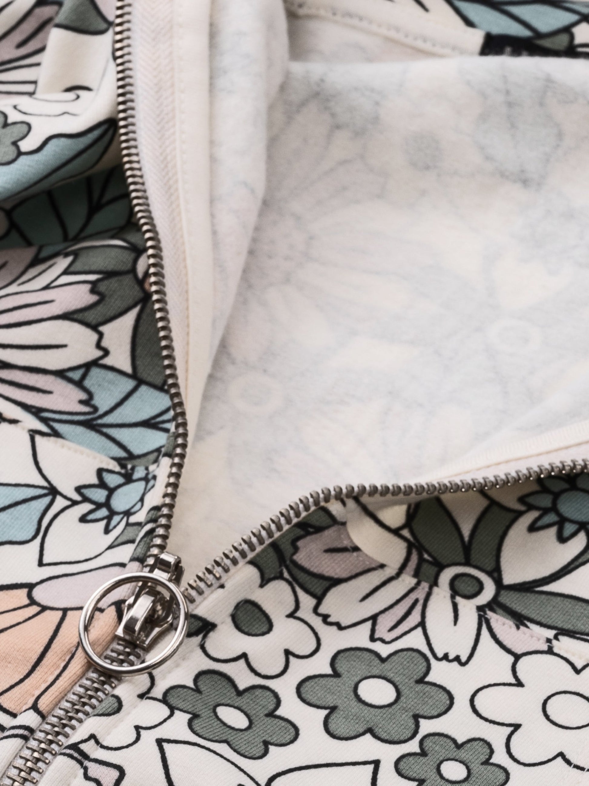 Mikina s kapucňou na zips s celoplošnou kvetinovou potlačou.